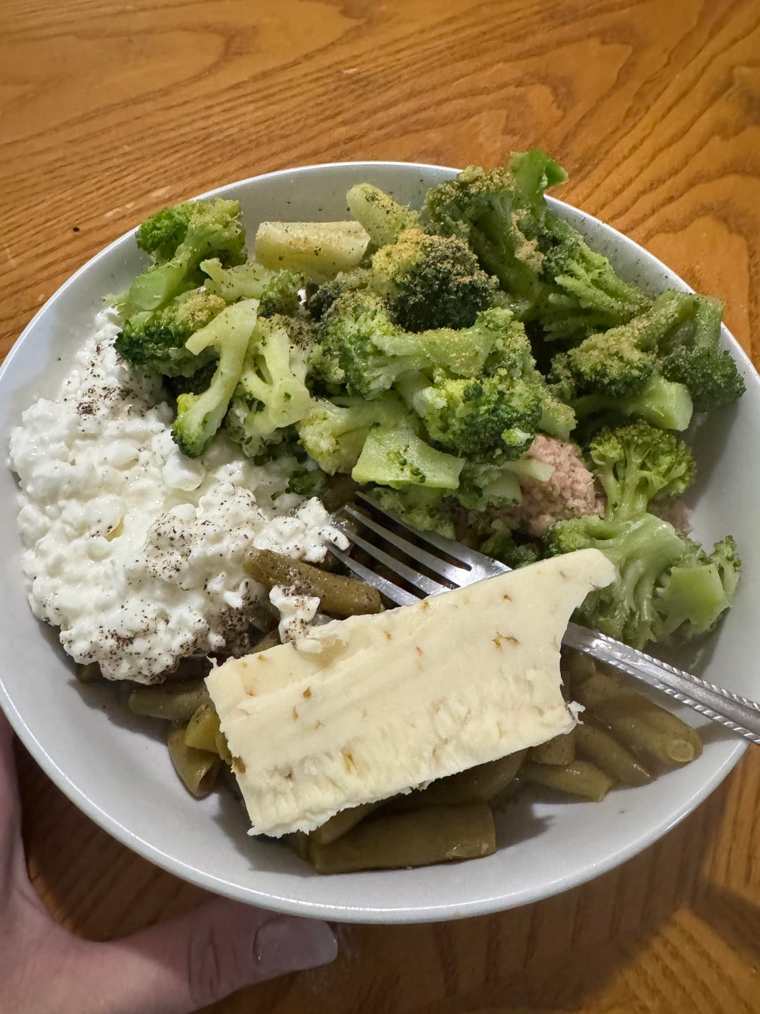 685 cals – green beans tuna broccoli cottage cheese pepper jack – random plate