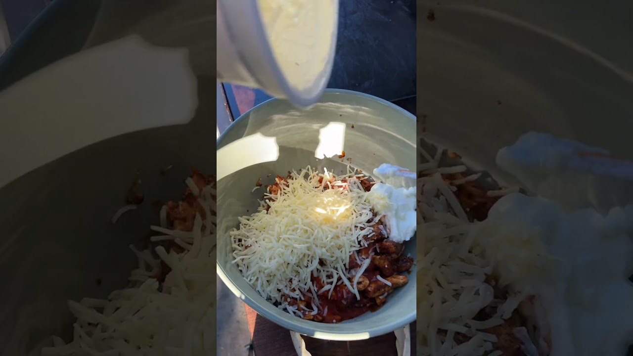 Cook 6–8 minutes, spreading chicken out so it gets golden and crispy. Lower heat slightly, add buffalo sauce, toss to coat. Place buffalo chicken in a bowl and mix with greek yogurt, shredded cheese, and chopped green onions. (You can also just do this directly on the griddle).