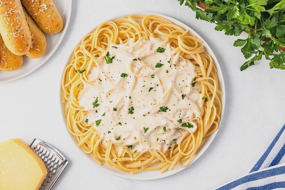 This [**easy Alfredo sauce**](https://www.kimschob.com/easy-alfredo-sauce/) recipe is ready in just **15 minutes** and uses only 5 ingredients to create the most creamy, rich sauce you’ve ever tasted. Made with butter, garlic, heavy cream, and freshly grated Parmesan cheese, this homemade Alfredo sauce beats any store-bought version every time.
