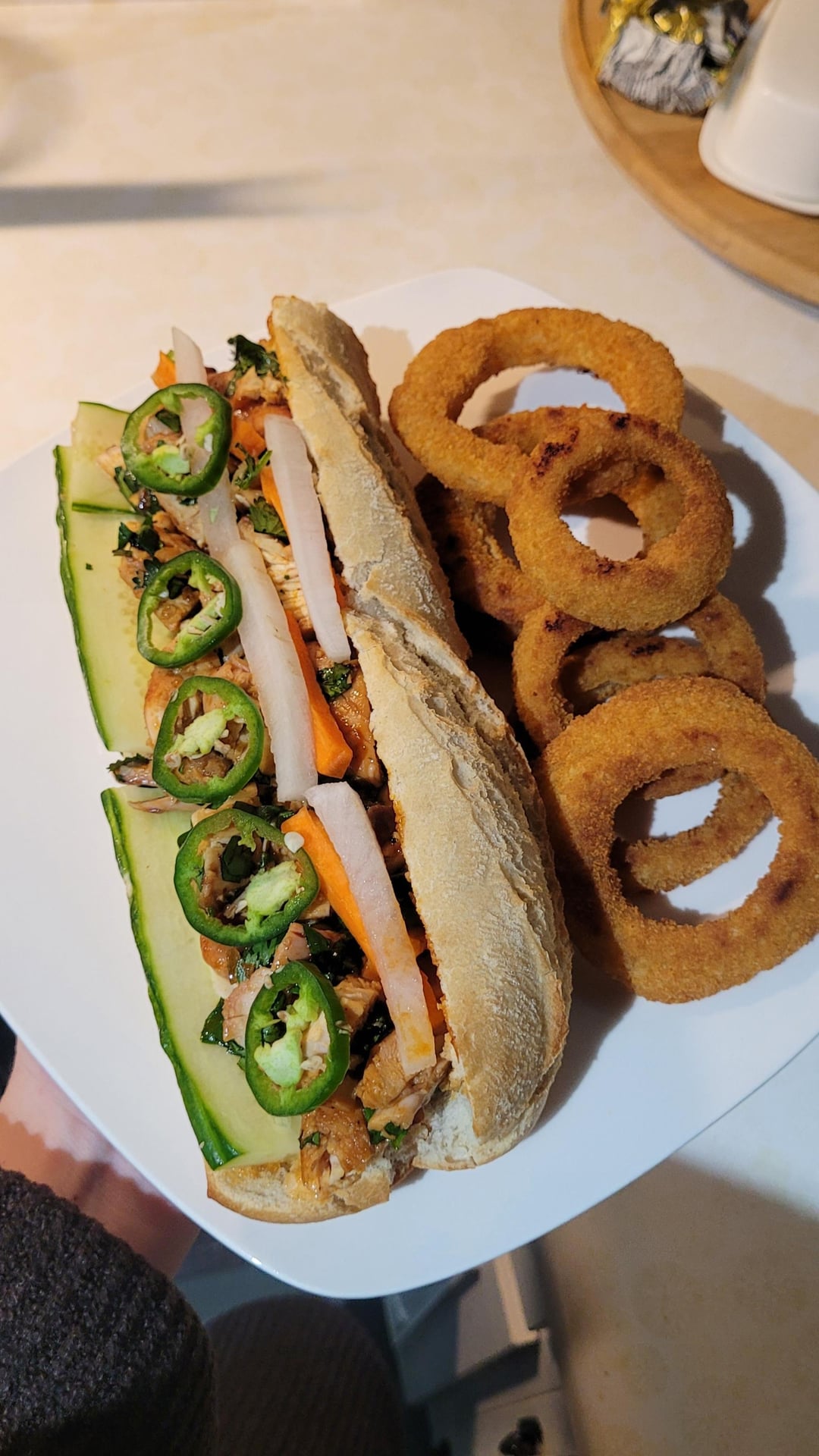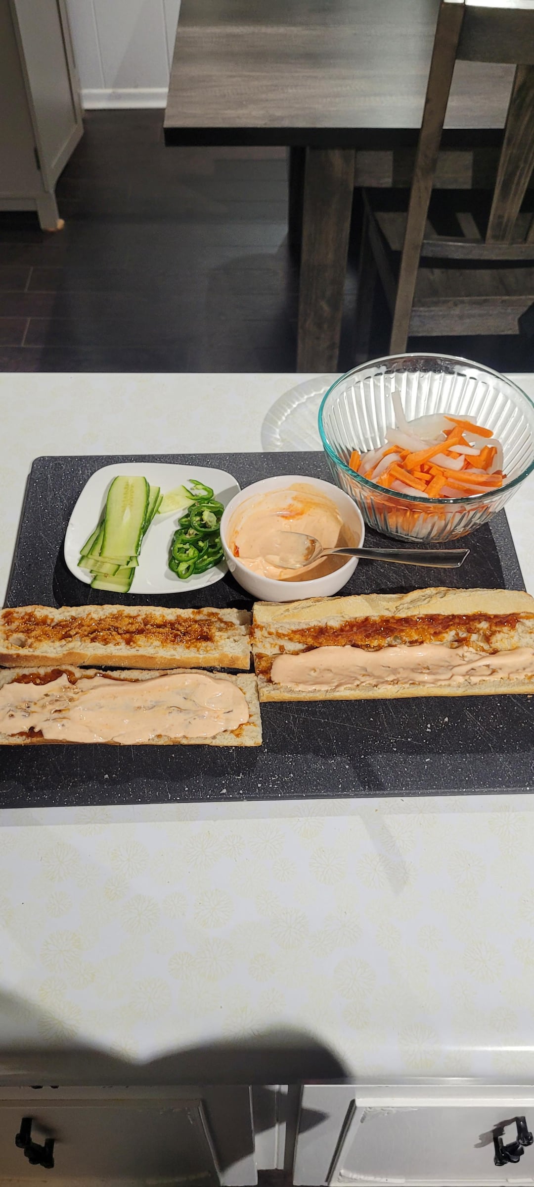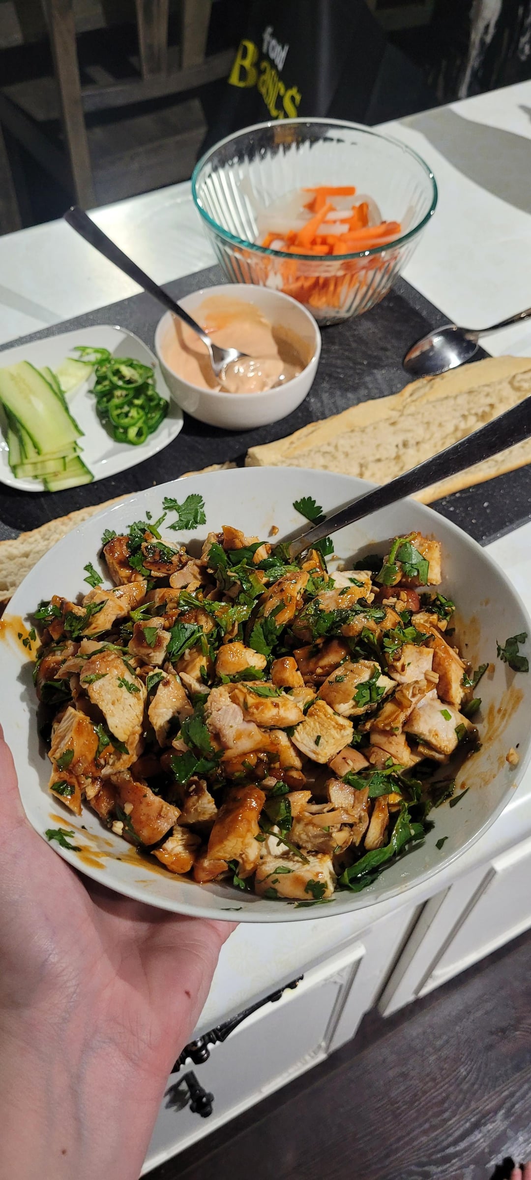 Made banh mi for the first time and it was amazing! I did a mix of chicken thighs and breasts in chopped garlic, lemongrass, fresh ground pepper, and a couple table spoons of homemade banh mi sauce. Air fried them and then chopped them up with a half head of cilantro. Layered the Baguette with banh mi sauce, Sriracha mayo, chicken, homemade pickled radish and carrots, cucumber and jalapeños. It was super fresh and the flavours really complimented each other!