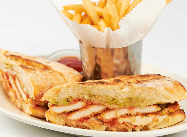 For a sit-down experience, order the Chicken Parmesan Sandwich at Cheesecake Factory. “Tender Chicken Lightly Coated in Parmesan Breadcrumbs, Tomato Sauce and Melted Cheese on a Freshly Grilled French Roll,” the menu says. Diners are obsessed with the chicken parm meal at the chain.