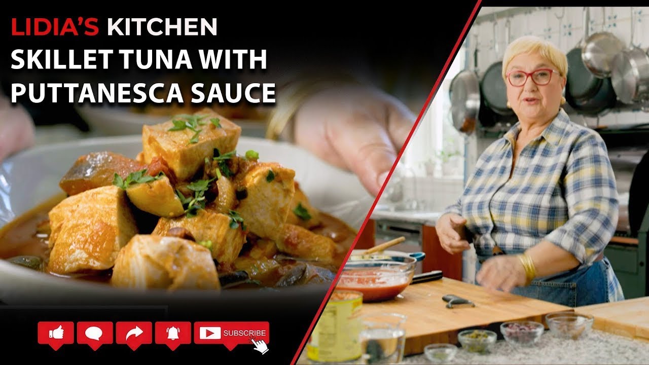 Skillet Tuna in Puttanesca Sauce. Here is a classic recipe, deliciously simple, to which I’m going to add my own twist – and it’s all prepared using only one pot! This recipe calls for tuna steaks, which can be expensive. Secondary cuts of tuna, such as tuna belly, can be used with results that are just as delicious. Buon Gusto! #LidiasRecipes #LidiasItaly #LidiasKitchen #LidiaBastianich #ItalianFood #FromLidiasTableToYours #LidiasSoundtrack @AccademiadeiCento #centofinefoods