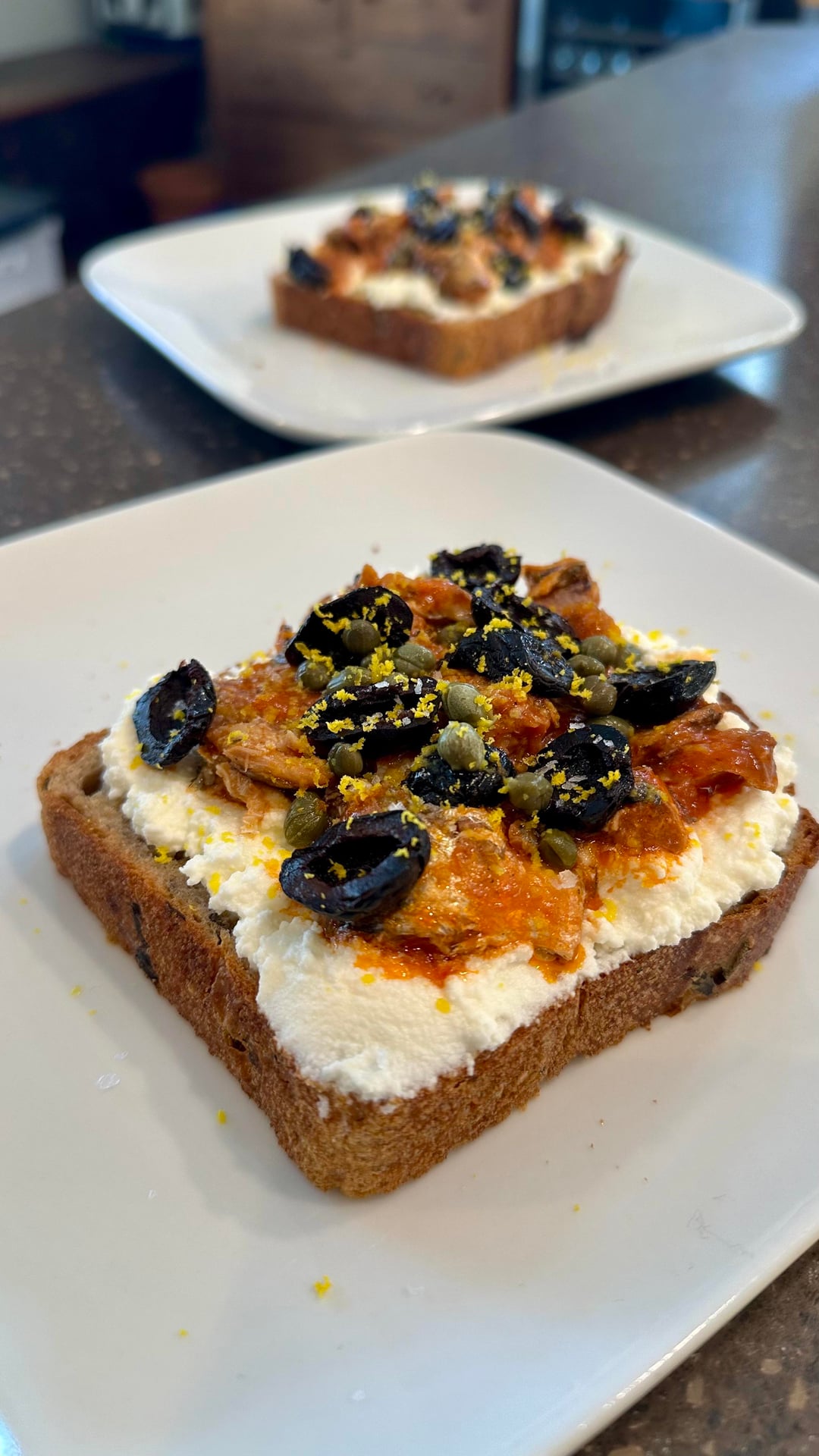 – Toast with ricotta, sardines in tomato sauce, cured olives, capers, and grated egg yolk.