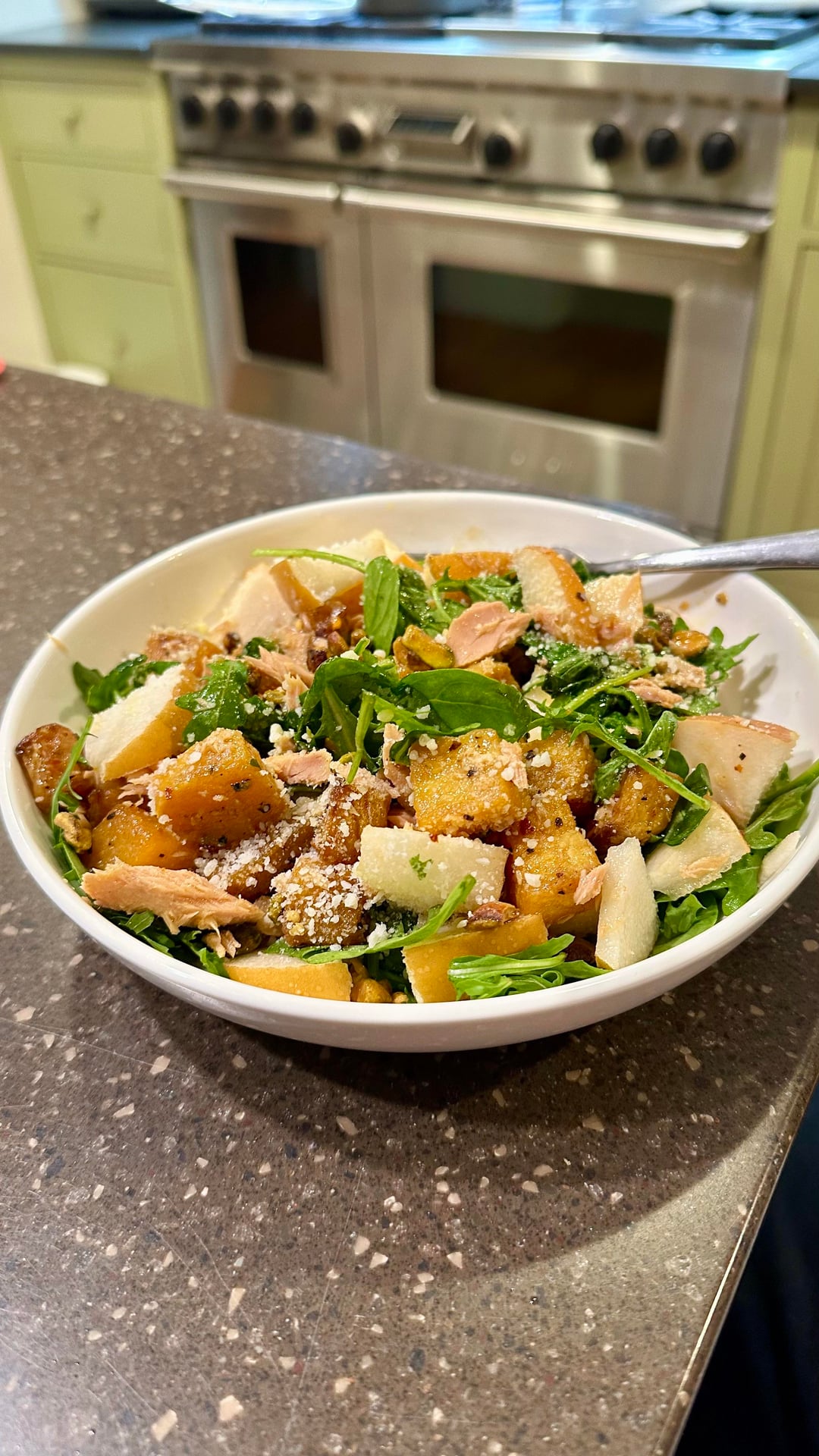 – Winter salad with spinach, arugula, Asian pear, roasted root veg and skipjack tuna. The chili crisp and pistachios I added later made a big difference.