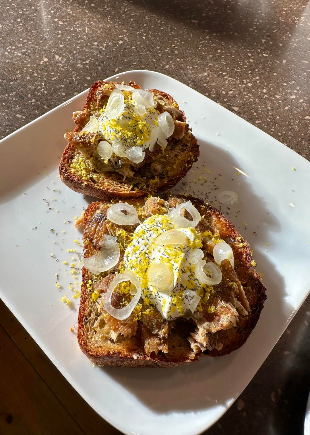 – Smoked herring on toast with crème fraîche, dill, grated cured egg yolk, and pickled cocktail onions (had to get creative using what I had lying around).