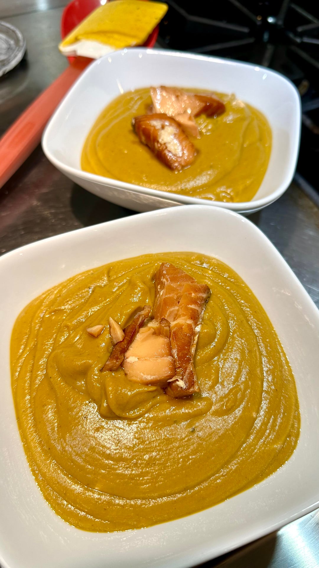 – Smoked salmon chunks on a winter veggie bisque with roasted honeynut and black futsu squash, rutabaga, and roasted chestnuts. This was a great pairing. I’m kicking myself for forgetting to add the rye crisps I bought just for this meal.