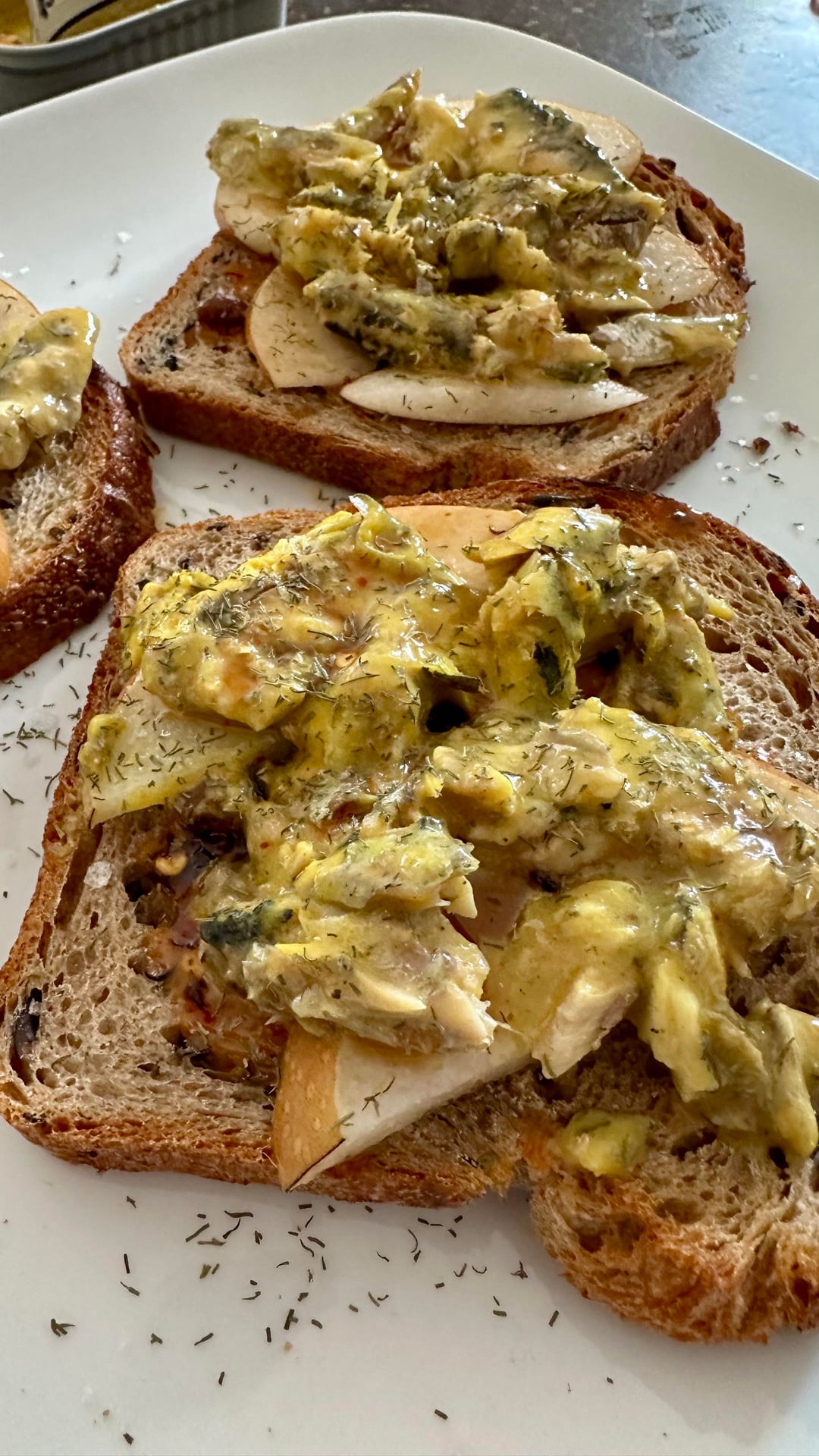 – Sardines in mustard sauce on toast, with sliced pear, maple chili “aioli” and dill.