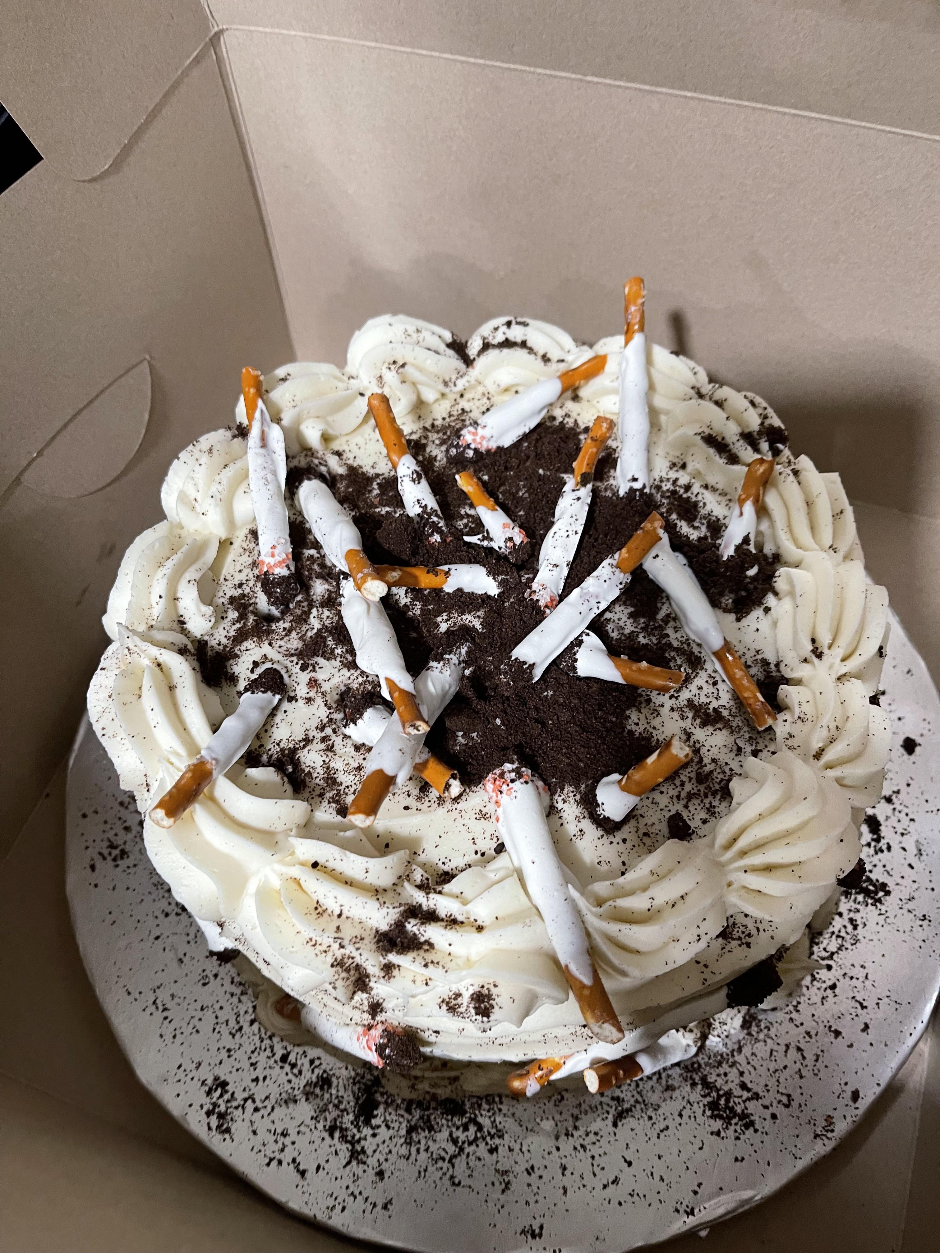 Okay why did I think there were half smoked cigarettes on top of this cake 😅😅 love me a chocolate dipped pretzel!!
