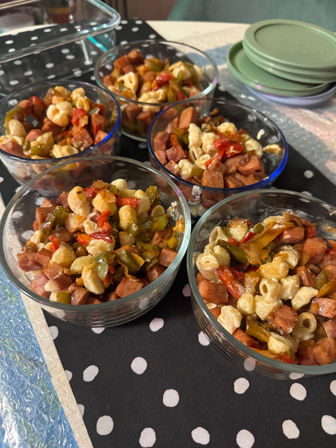 Another mac & cheese prep (my fave) – jalapeño mac with ham, bell pepper, and onions. 381 cal per serving.