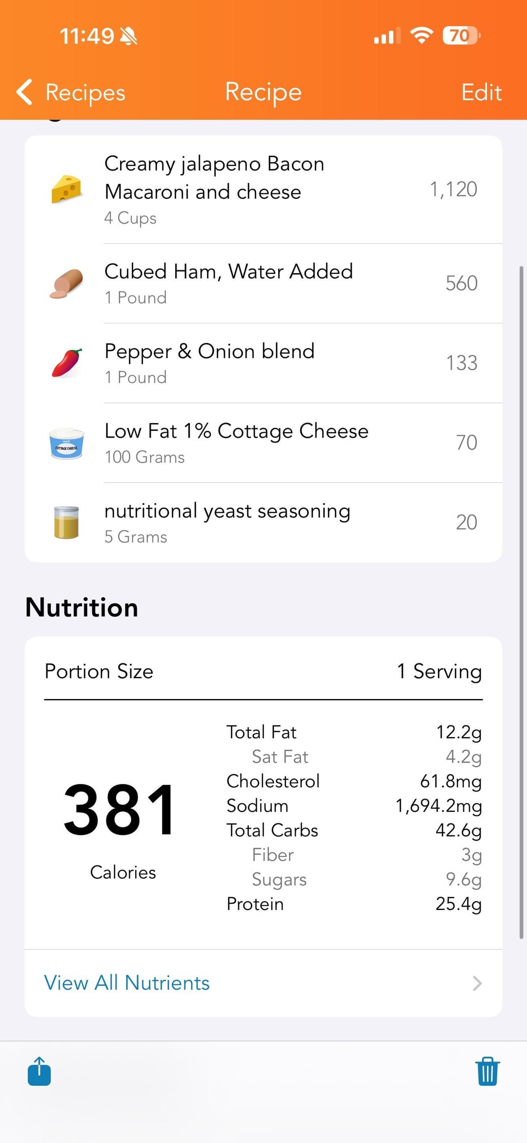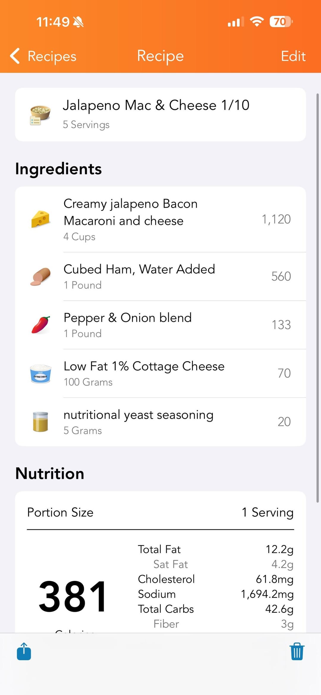 Mac and cheese remains my tried and true favorite for meal prep – it’s just so versatile and quick. Any protein can work. Any veg you like can work. Perfect canvas for adding additional nutrients like the cottage cheese and nutritional yeast. And in my opinion, it freezes very well, though I know some will disagree and don’t like freezing any kind of pasta. Is this one in high in sodium? YES. I won’t deny that, but – the rest of my meals are very low, so it works for me. Adjust as you see fit if this doesn’t fit your own goals and needs. App is called LoseIt! Ingredients are in the screenshots. It’s basically one box of Jalapeño Mac & Cheese, one package of cubed ham, one package of frozen bell peppers and onions, plus the cottage cheese and nutritional yeast amounts listed.