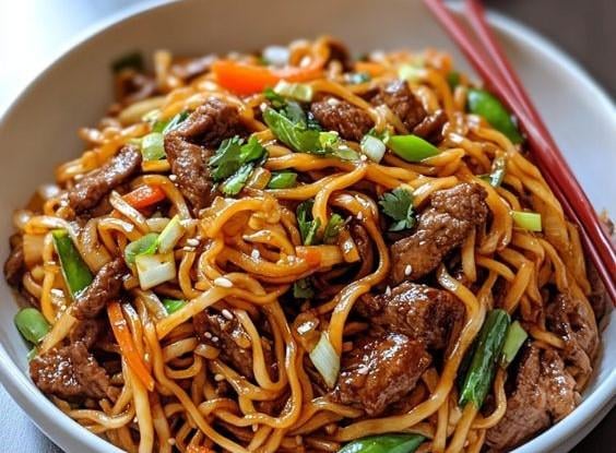 5. **Combine:** Return beef + noodles. Toss and stir-fry 2–3 min.