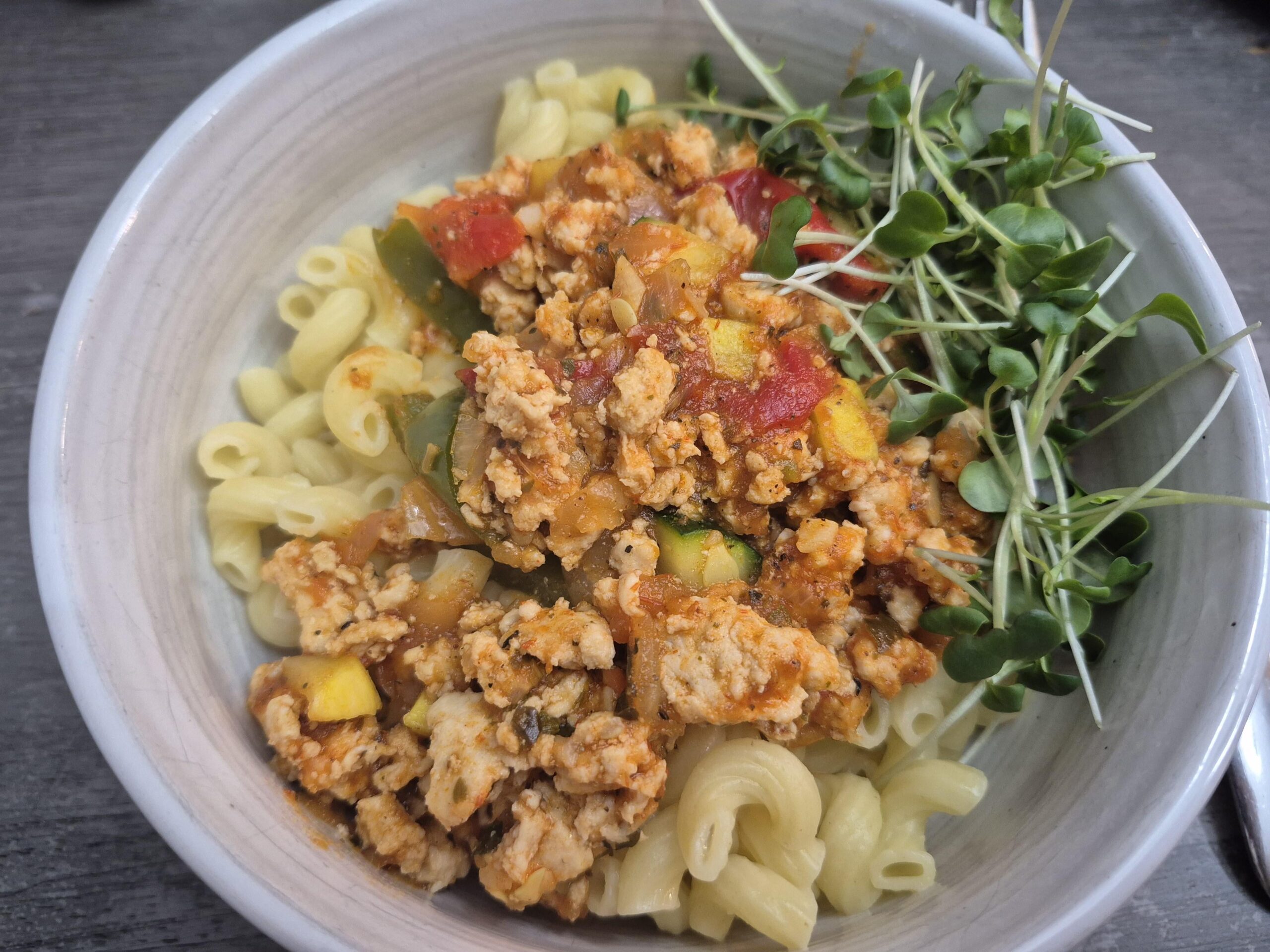 I cooked 2 lbs ground turkey, added the seasonings i wanted, put in a bowl and set aside. With a bit of olive oil, I cooked onion and garlic and then added 1 chopped yellow zucchini, 1 chopped green zucchini, and chopped mixed bell peppers from frozen. Cooked the veggies to my desired doneness, added the turkey back in, and added my favorite marinara sauce.