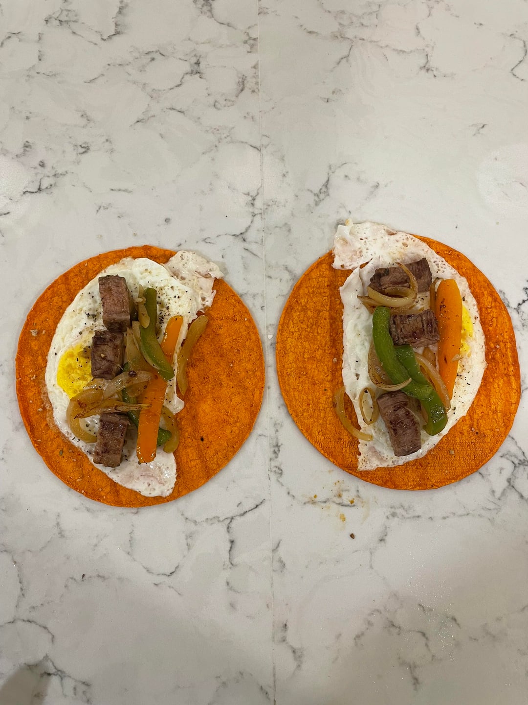 Enchilada tortilla, over easy egg, flank steak, peppers & onions, arbol salsa, pickled onions. by philed1337 Dining and Cooking