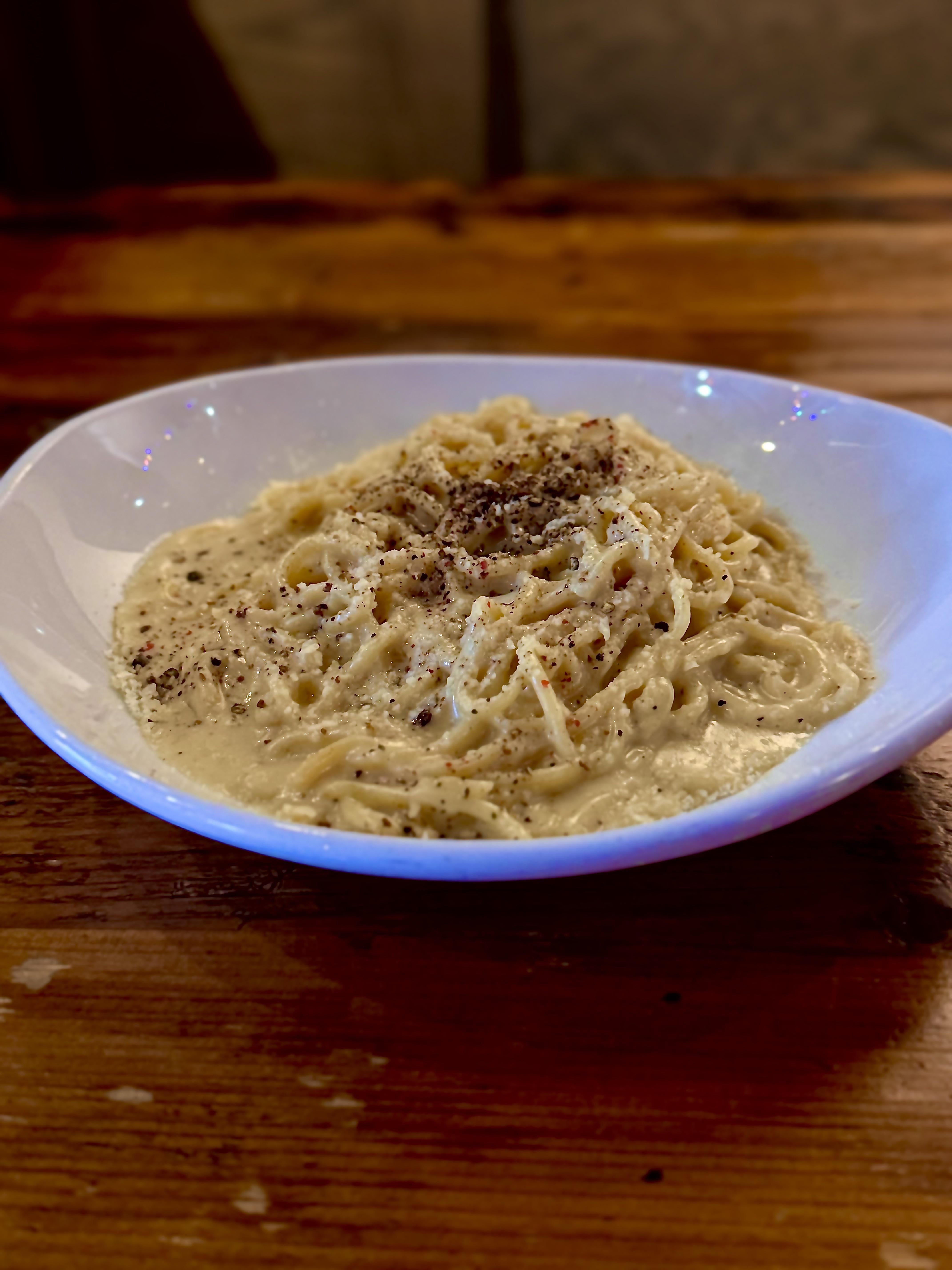 We make our cacio sauce using whey byproduct from when we make our ricotta. The cheese blend is 75% parm, 25% pecorino. Then we use a blend of 4 different peppercorns. Bit of butter for emulsion. So good. The whey makes it slightly sweet and tangy.