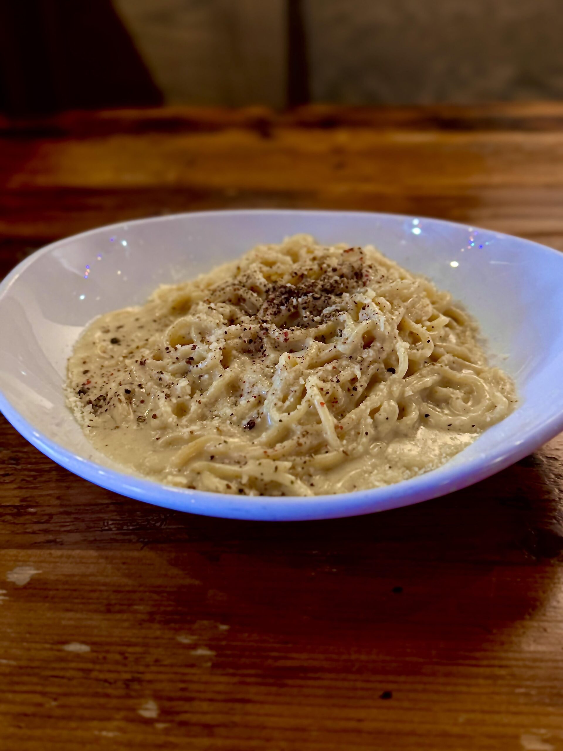 We make our cacio sauce using whey byproduct from when we make our ricotta. The cheese blend is 75% parm, 25% pecorino. Then we use a blend of 4 different peppercorns. Bit of butter for emulsion. So good. The whey makes it slightly sweet and tangy.