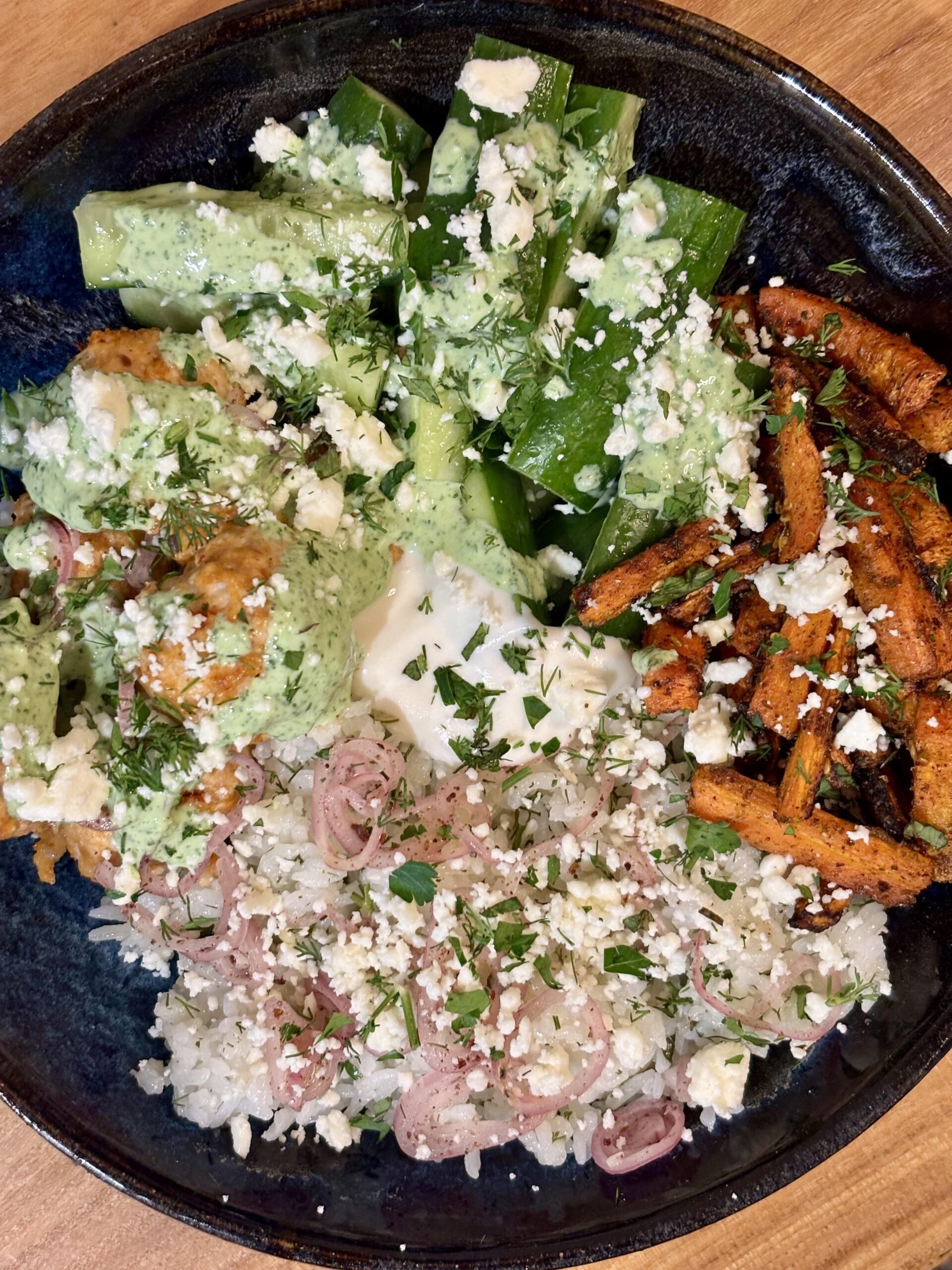 – yogurt green sauce (nonfat greek yogurt, EVOO, jalepeno, cilantro, parsley, lemon juice, salt, MSG, garlic)