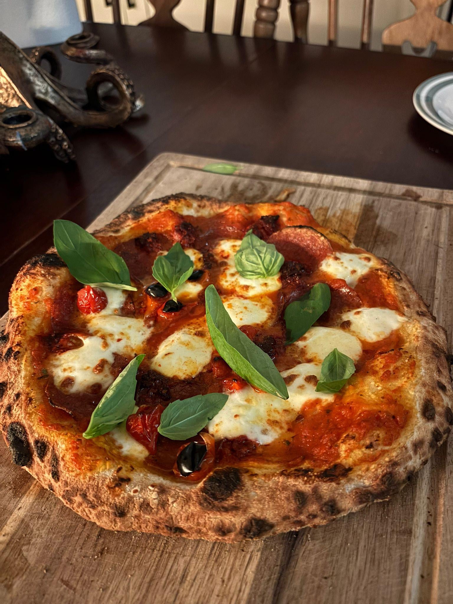 Just started getting into making pizza. This was my fourth attempt at Neapolitan style. For this batch of dough it was 60% hydration, 3% salt with dough balls weighing out at 270g. Cooking on wood on the Ooni Karu 2nd gen.