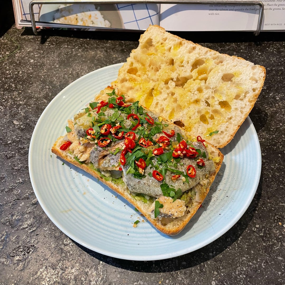 The sandwich (bottom-up) is ciabatta bread with avocado, quick pickled shallot, the trout, flat-leaf parsley, bird's eye chillies and some of the lemony olive oil from the tin. Plenty of salt and pepper. Simple(ish) and SUPER delicious!