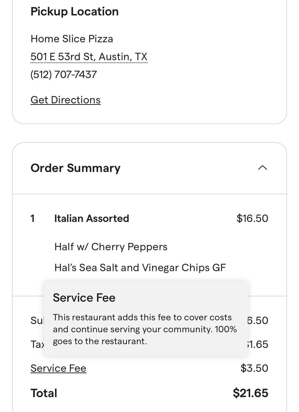 To go pickup order for a half sub and chips, which I kinda think is already priced steep at $16.50, then being forced to pay 21% “service fee” is kind of making me not want to come back.