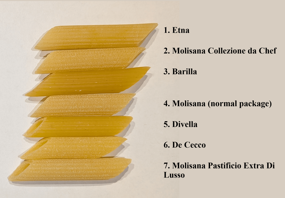 The Barilla and divella look just horrible in the lineup of dried pasta. I wouldn’t even consider trying them. The more yellow/orange color you see, the lower the quality due to forcing a quick dry with heat. The problem hear is it removes the starches that are necessary in a good pasta plus loses proteins. The whiter the pasta is is a sign of a slow dry which maintains the starches and proteins. The starch allows the sauce to stick to the pasta, so you should never rinse after cooking. The other problem I see with those two is they look so smooth. A good pasta will have a rough exterior like a sand paper. This is another element that looks the sauce to stick to the pasta.