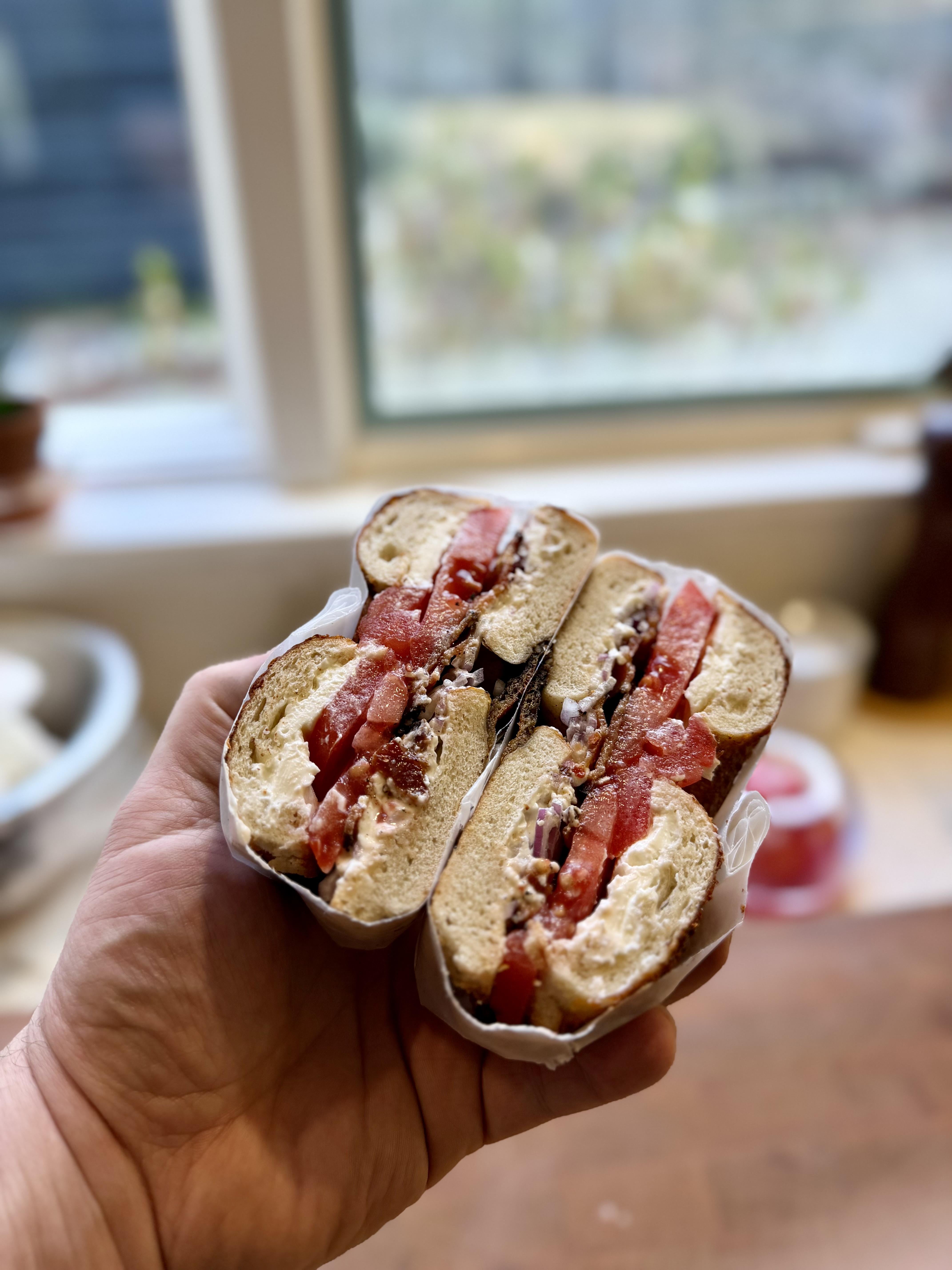 Tomato, bacon, red onion, cream cheese, on a Cacio e Pepe (Asiago, Provolone, and black pepper) New Haven style bagel.by reforminded 2 Comments MagazineDelicious151 2 months ago Looks good ProfessorLongBrick 2 months ago I’d pay you to make me this sandwich.