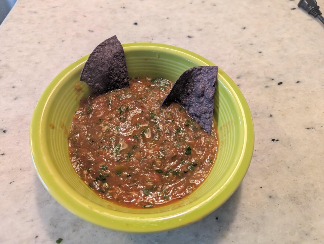 6 Roma tomatoes, 2 jalapenos, 7 small cloves of garlic, small red onion, 6 or 7 chilies de arbol, handful of cilantro, 1/2 tsp Better Than Bouillon Chicken, 1/2 tsp cumin, 2 tbsp lime juice