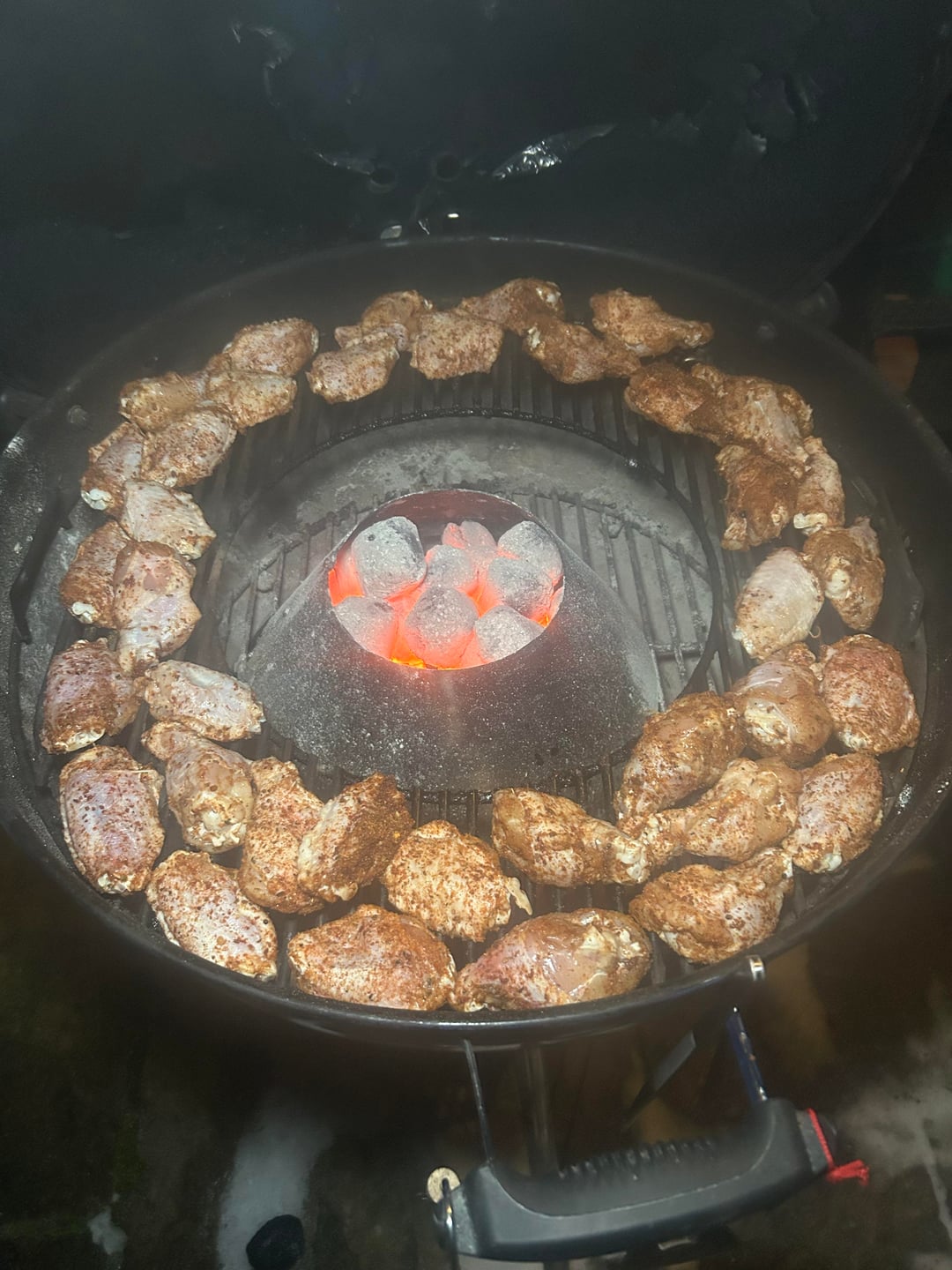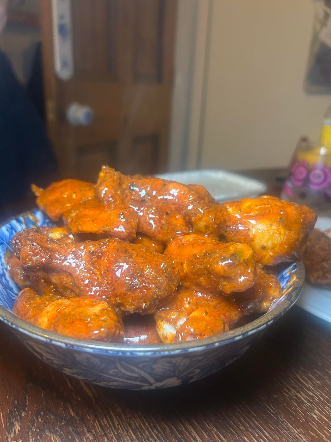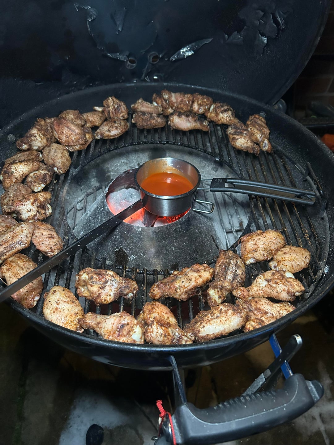 Brined them overnight, then cooked using the Vortex, and then finished with black truffle butter Franks Red Hot Sauce, blue cheese ranch on the side for dippies!