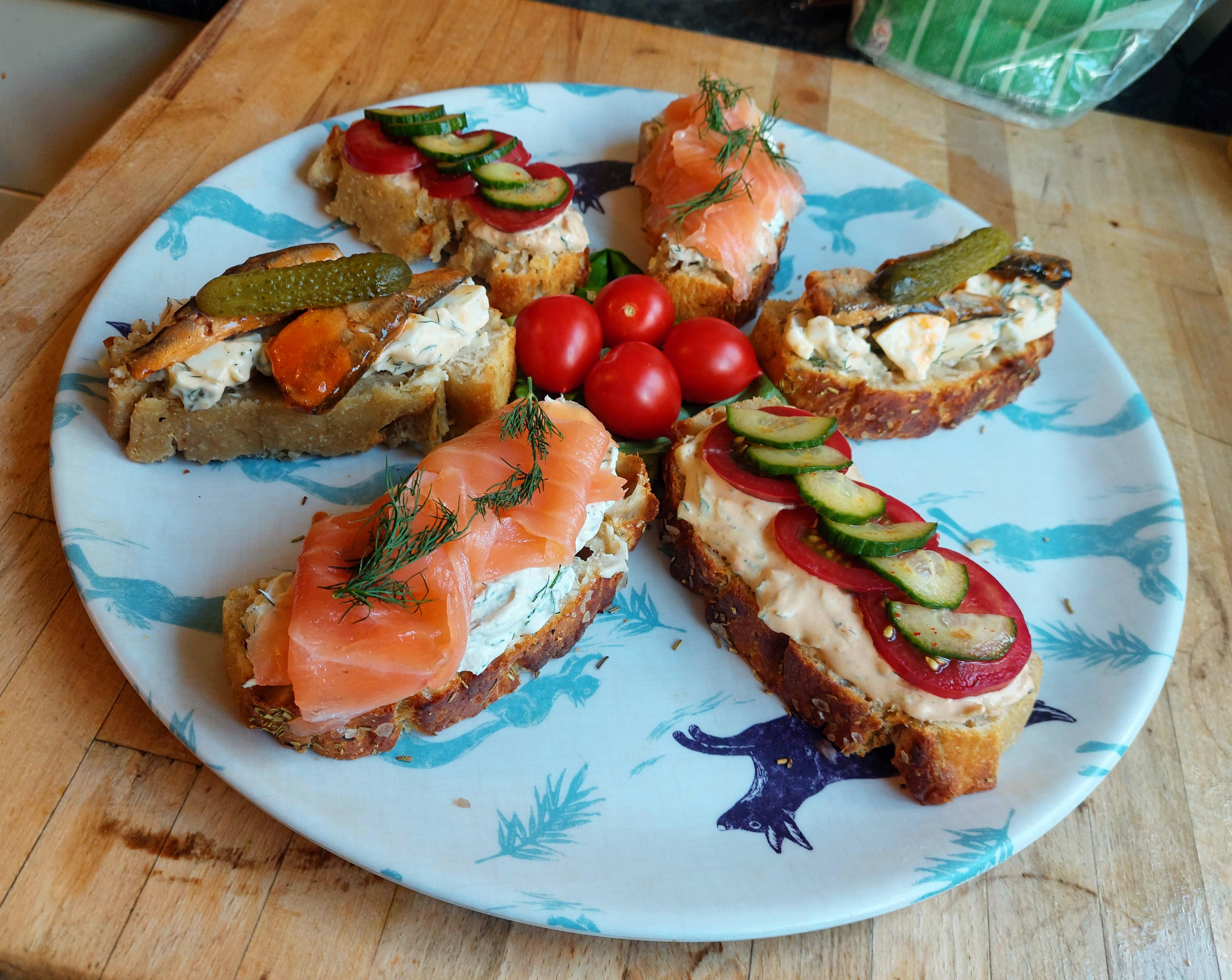 These were made on my fiancé’s homemade sourdough, topped with an assortment of classics: a cream cheese-mayo spread with sliced cucumber and tomato; tomato and sour-cream cream cheese with smoked salmon; and pickled herring with mayonnaise, egg, and pickled cornichons. Everything had plenty of fresh dill.