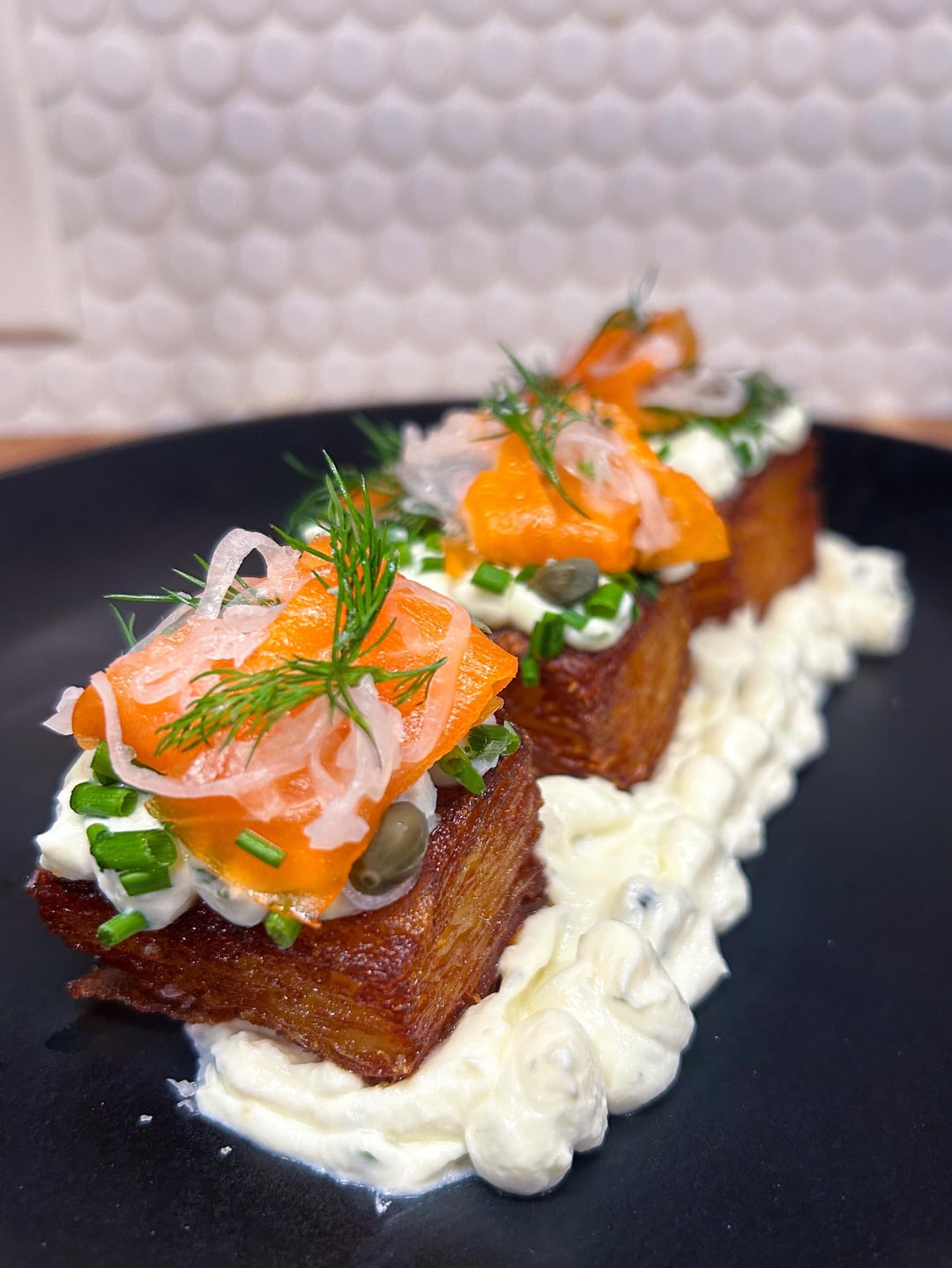 Always think plating looks better with an odd number of pieces. Also too much shmoo on the black plate, liked how it was just under individual pieces in the first picture. Looks yummy chef.