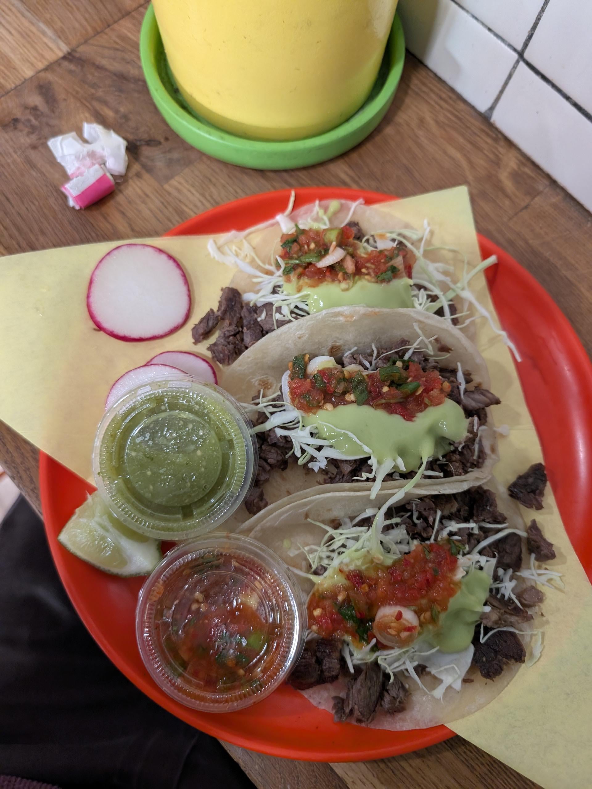 I was super excited to try it out since it has such a cult following and I'm looking a good norteño style flour taco place. I really really wanted to love this place but it's really not worth all the hype. The tortillas were fine, but the asada really do the tacos no favors. The beef wasn't marinated well enough, making it a bit dry, tough, and lacking flavorwise. Not a big fan of chunky tomato salsa, but everyone here puts it on their tacos so whatever. Similarly, the tacos run are in the smaller side, but maybe that's how they do it in Sonora.