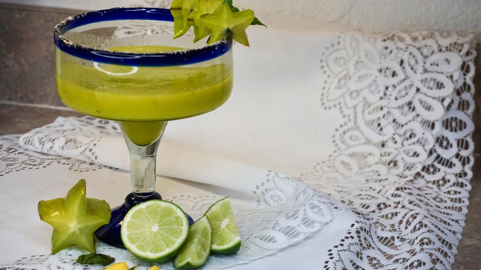 Slice starfruit for garnish if desired, and wedge on the rim of the glass.