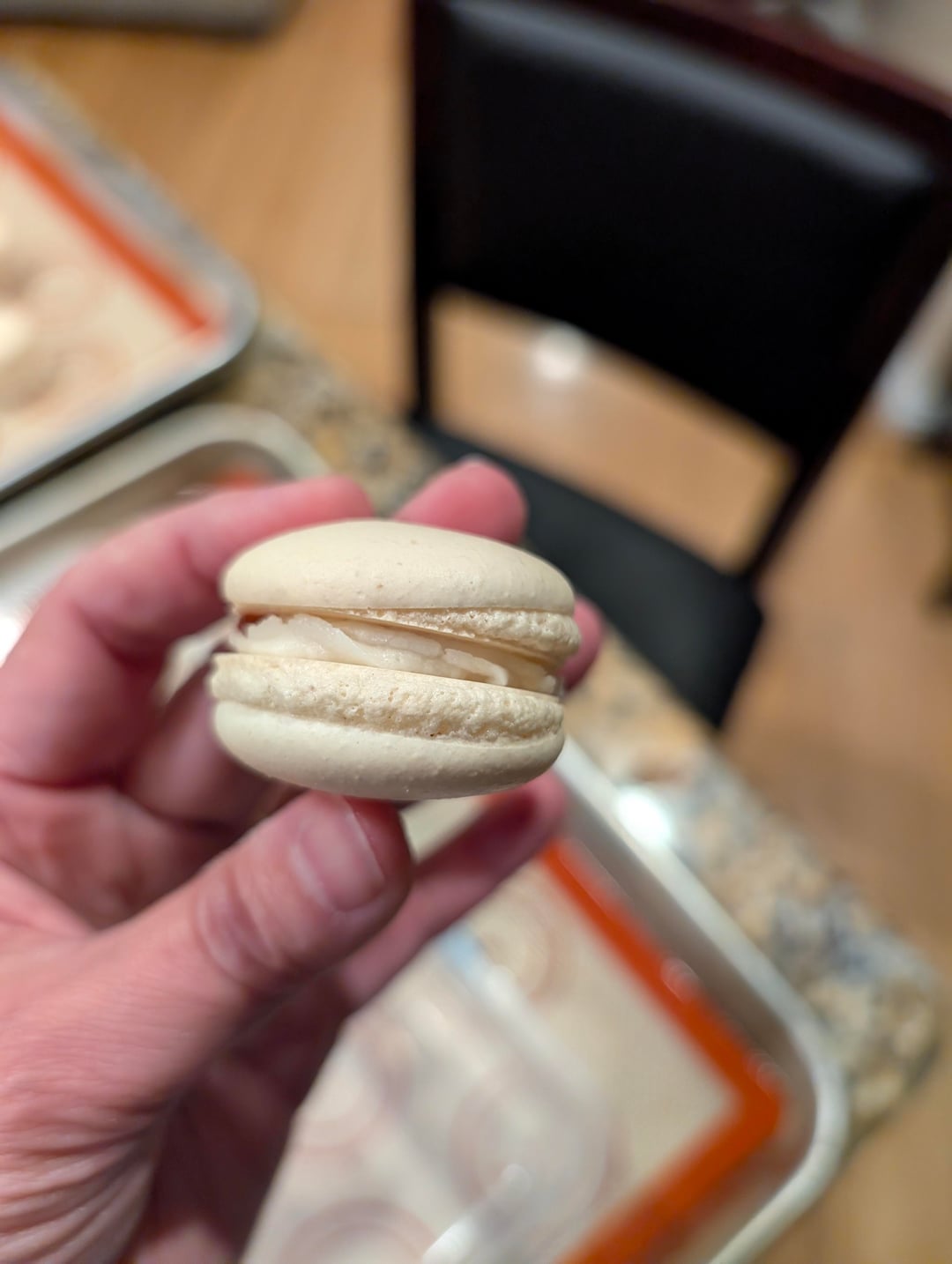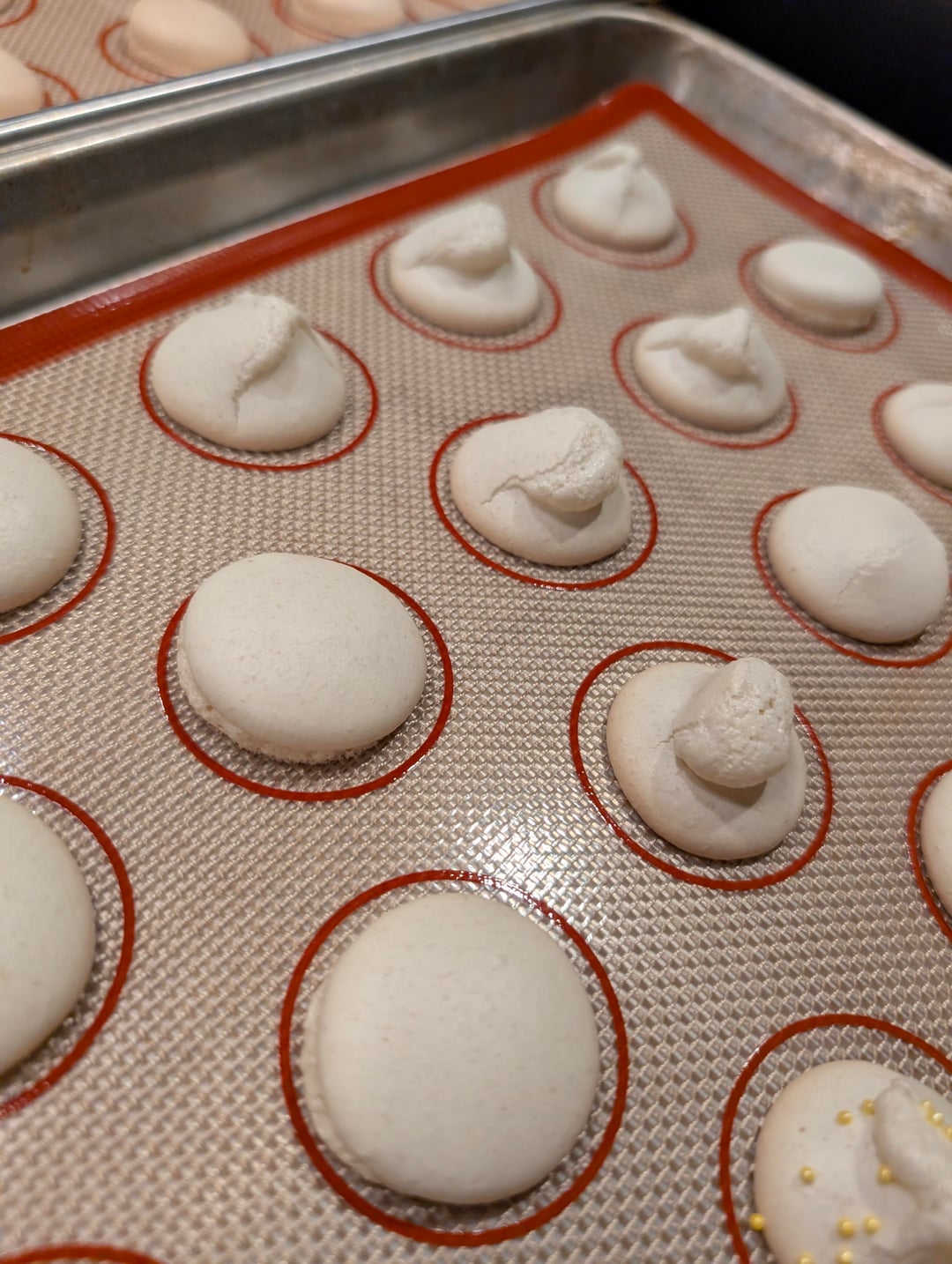 Just joined this group. Long afraid of macarons but consider myself a decent baker. This is my third attempt. First time, I made French macarons and they were too chewy so I pivoted to Italian method for second time and liked those better but I messed up by taking the sugar off at the wrong temp (misread Celsius/Fahrenheit directions). Even with that mess-up, I salvaged about half and they tasted decent. For this, my third time, I was convinced I would get it right with once again using Italian method and being careful with the temp. And yet … A handful looked like these weird volcanoes and then the ones that looked ok had inconsistent feet. They actually taste somewhat ok (maybe a little too crispy?). Would appreciate some feedback on whether this a failure during macronage or the oven temp.