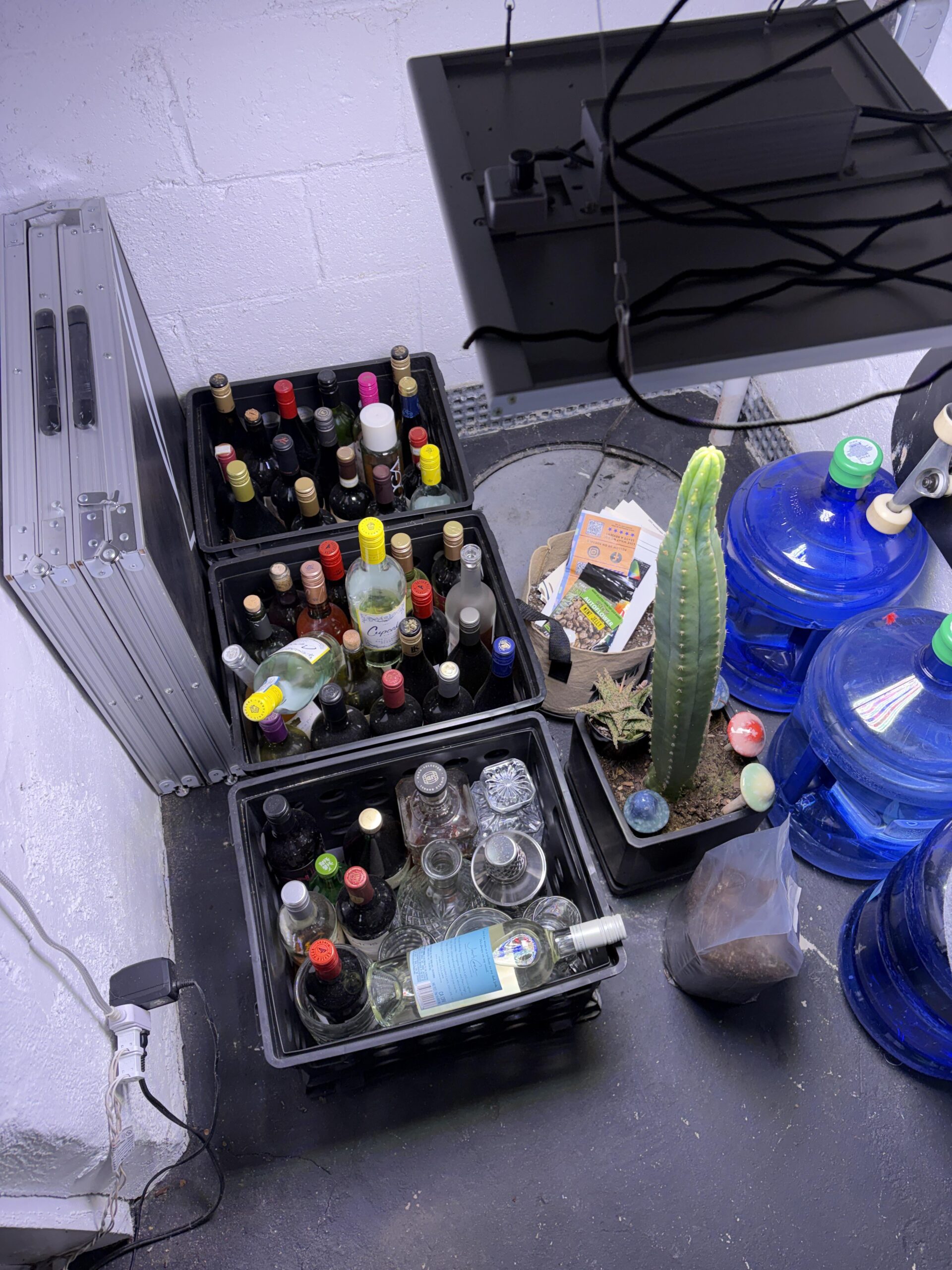 i dont even know what im looking at – some bottles open just sitting there, some to the side, half consumed cupcake. Why is there a catus in the bottom of a basement with a random light with other booze. Man i just work here.