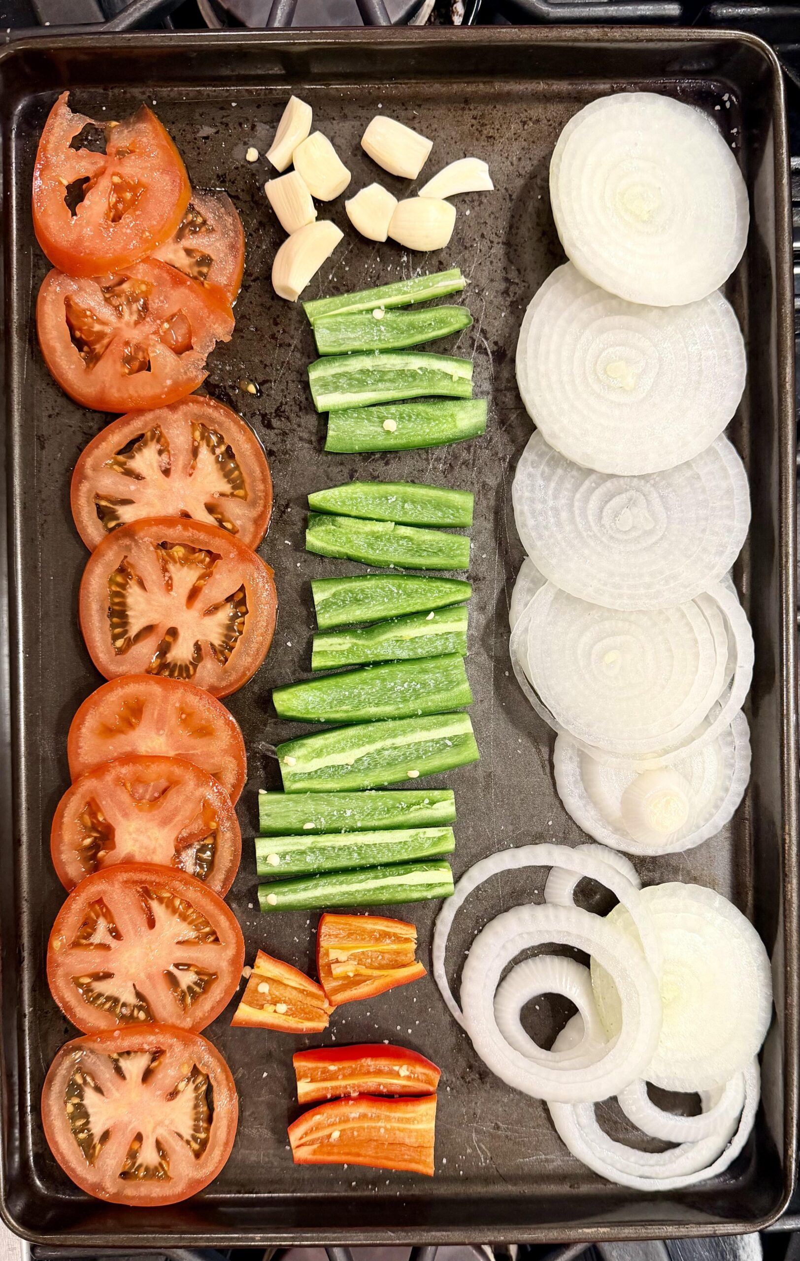 iZoooom 3 months ago * 1 sweet walla walla onion * 2x jalapeño * 1x cerrano * 2x red peppers that are shaped like jalapeño * 1x heirloom tomato * lots of garlic cloves Salted. Olive oiled. Broiled until charred. Mixed in a food processor. Added cilantro, bit of white vinegar, and lime juice. (Note: should have added 2 more tomatoes)