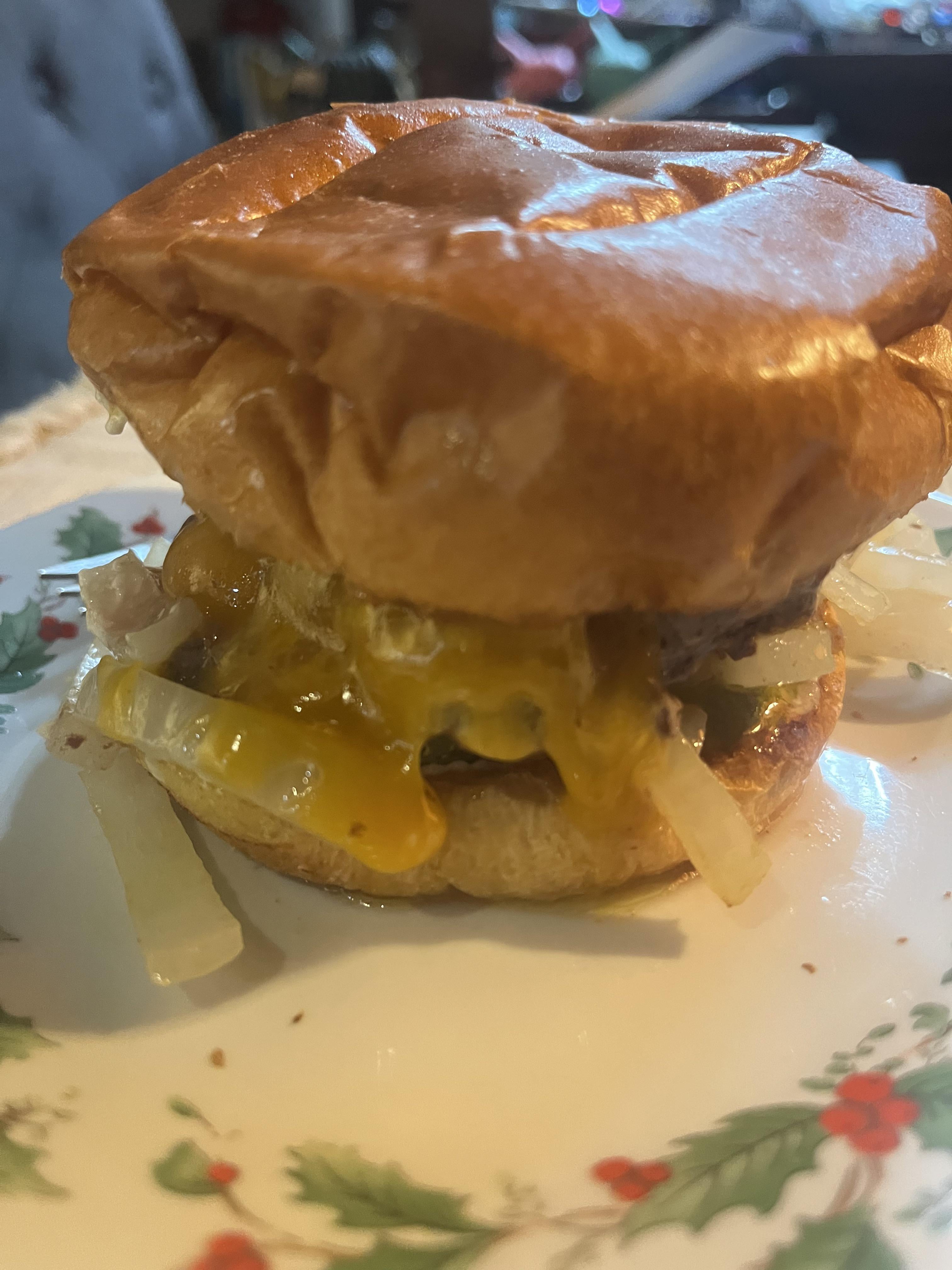 Cheddar, dill and sweet pickles, sautéed onions.by UnhappyTemperature18 3 Comments Jaytendo_Boi 3 months ago Hell yeah Ok-Independence-7339 3 months ago What’s uh…going on with your top bun? Cyborg_Mom 3 months ago Bun looks like a chef hat 😂🤣😅