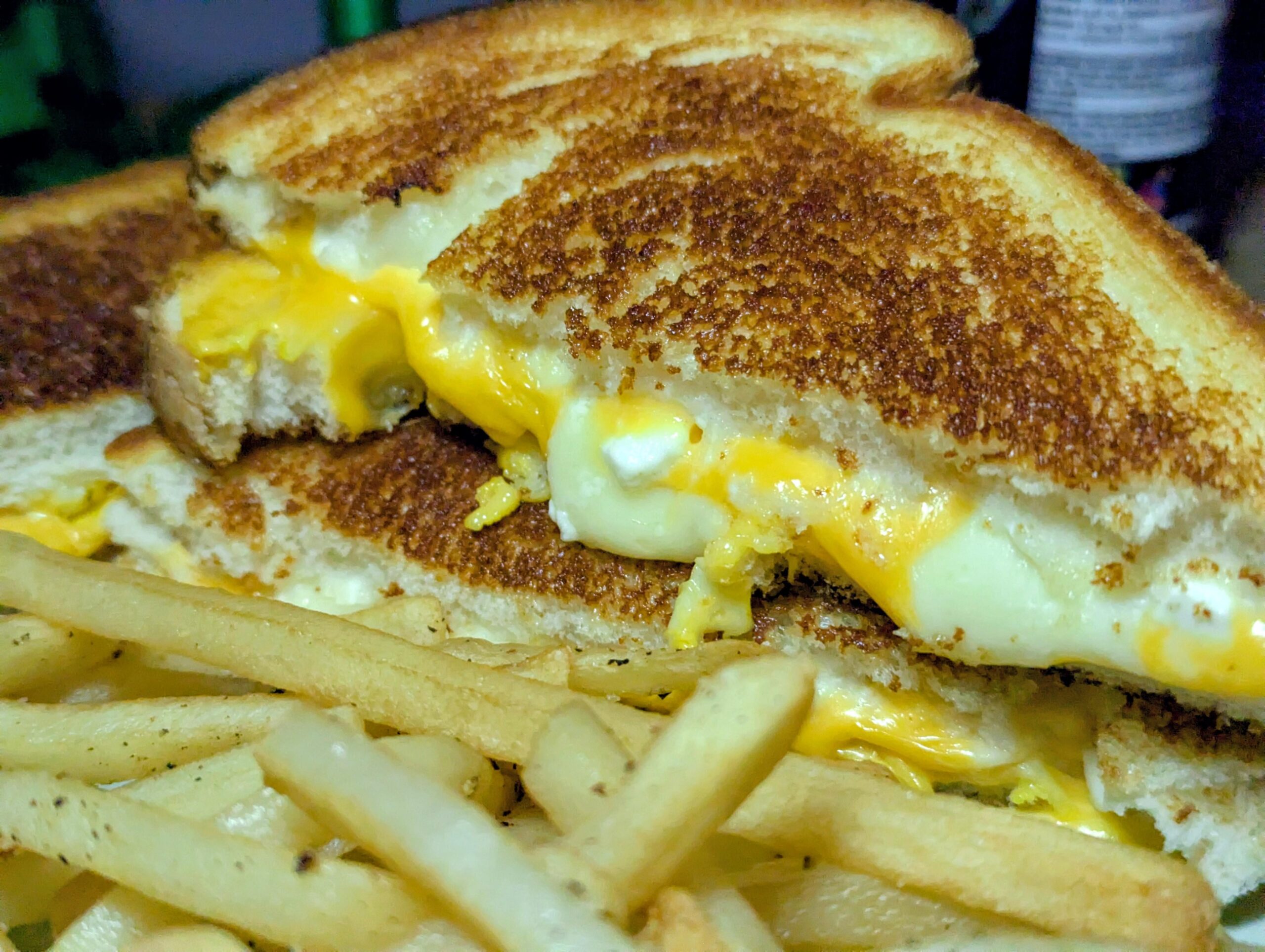 Processed slices, cheddar cheese curds, cottage cheese and shredded Parmesan. White bread, greased with Margerine.