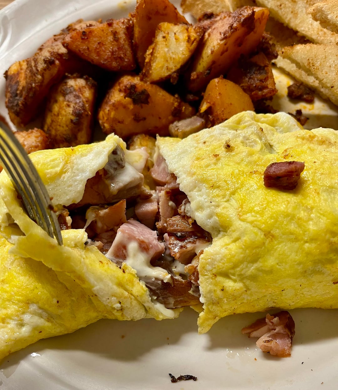 Meat Lovers omelette: LOADED! with ham, sausage, & bacon + melted American cheese 🤌….Served with a heaping portion of home fries cooked to perfection. They really load you up with the potatoes at this joint so I gave my mom some of mine before I took the pic. Also 4 pieces of toast as seen. Another 10 for Little George’s 👌