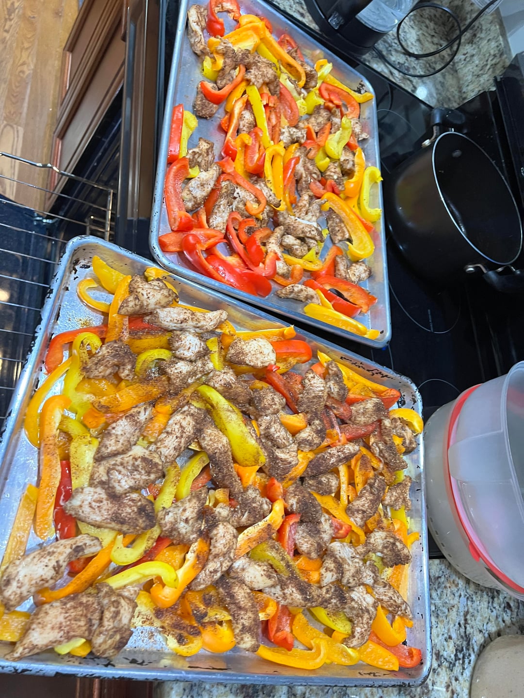 Simple week! Sheet pan chicken fajitas – cut up bell peppers – cup up chicken breast – season with fajita seasoning – 30ish minutes at 350 degrees