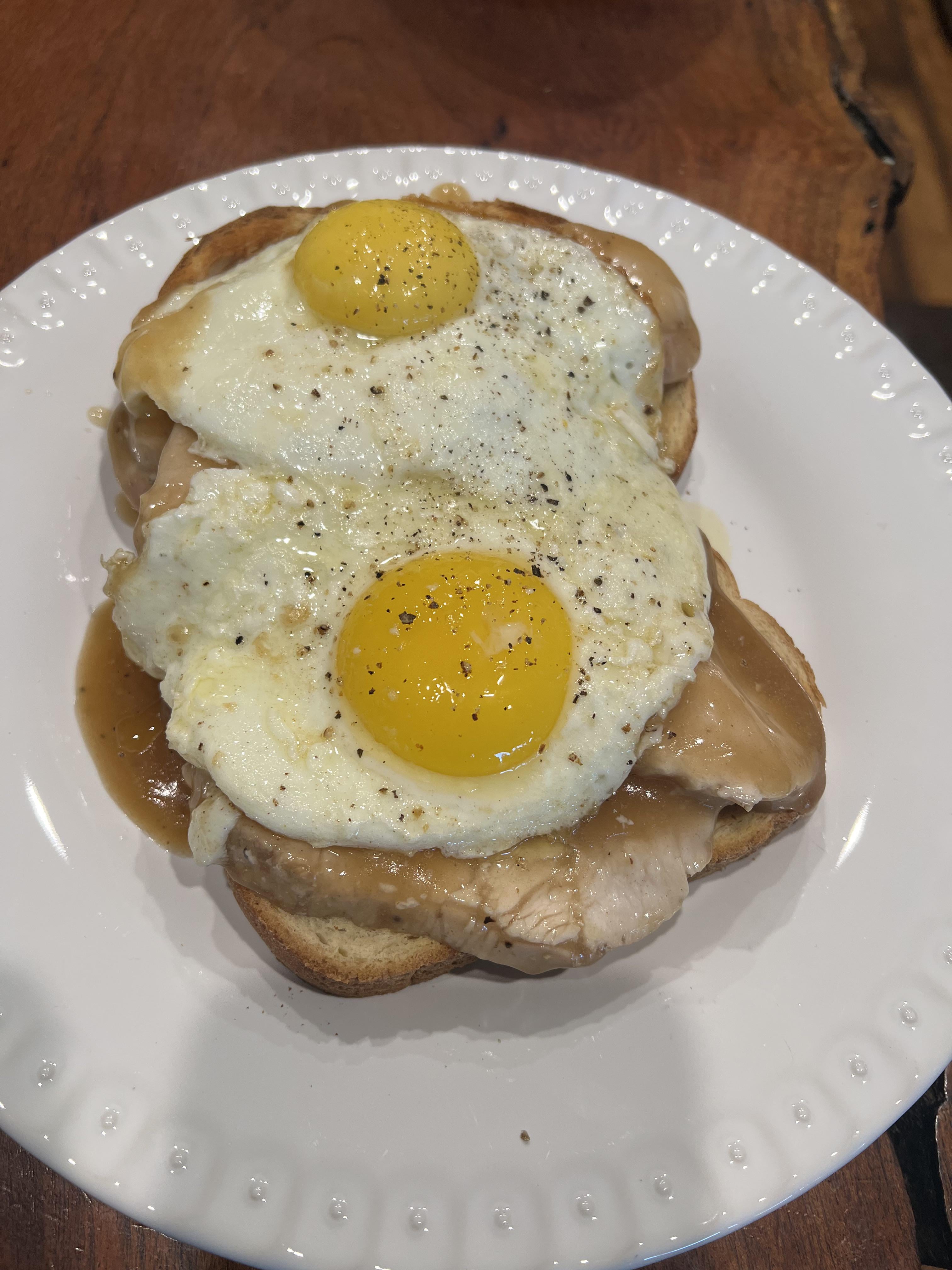 Turkey Toast w/gravy underneath. by Gourmetanniemack 1 Comment joelfarris 11 hours ago I didn’t know that slices of turkey with gravy could go with eggs until just now, but you’re gonna have to warn me, just how messy is this about to get?