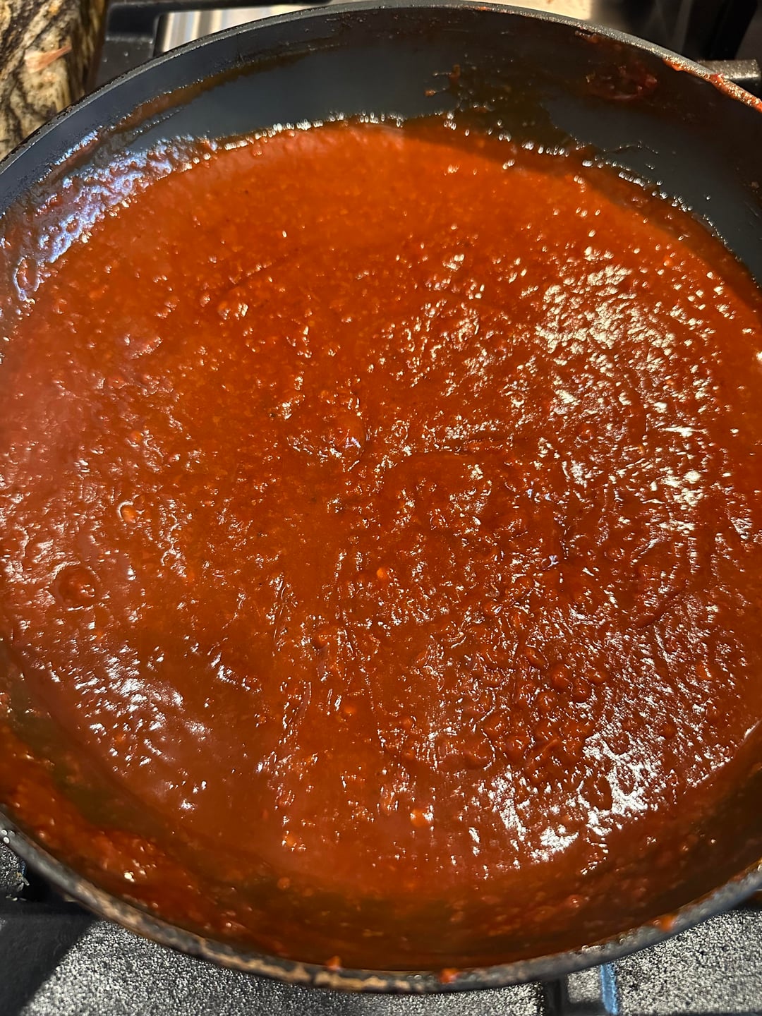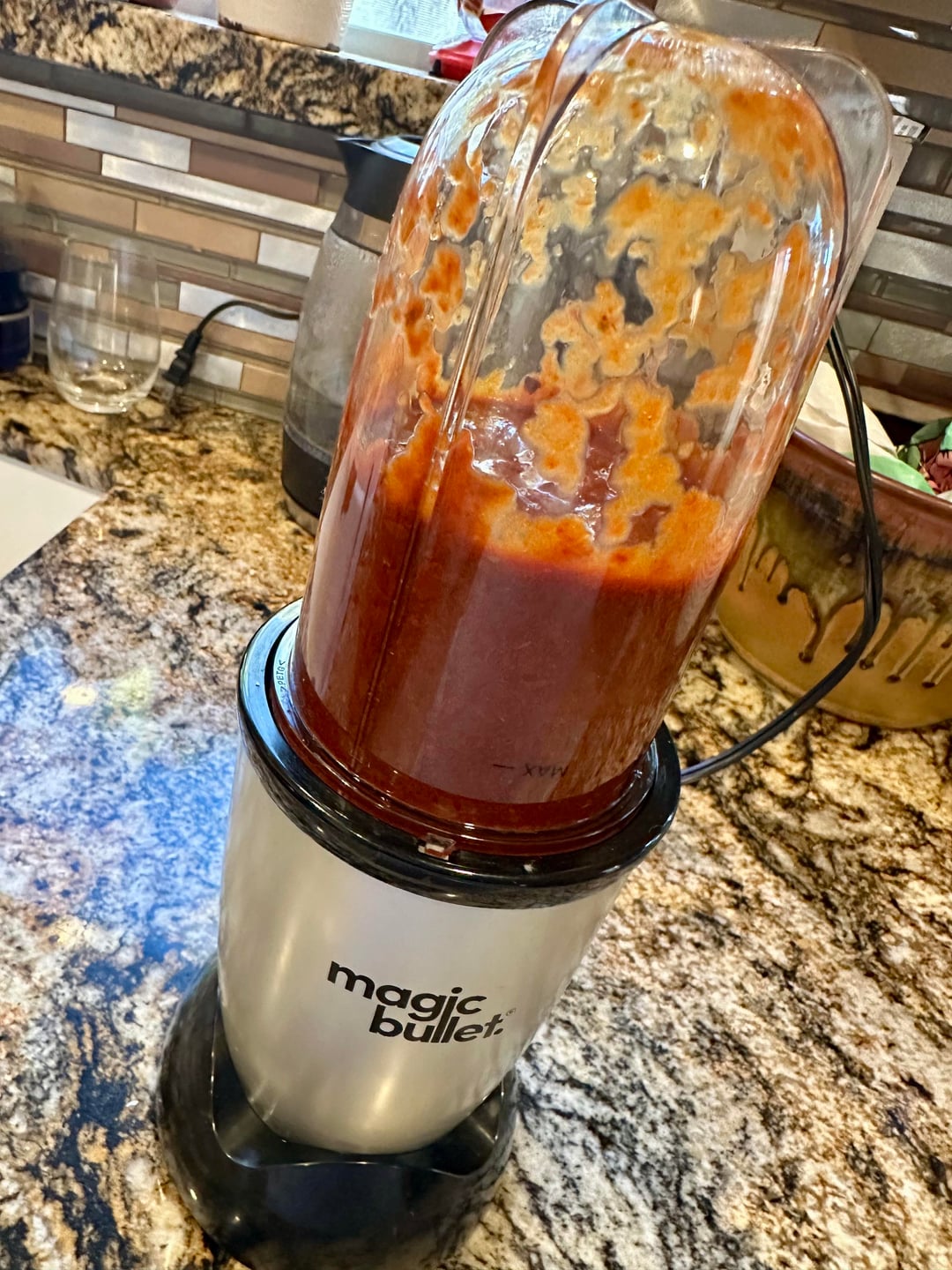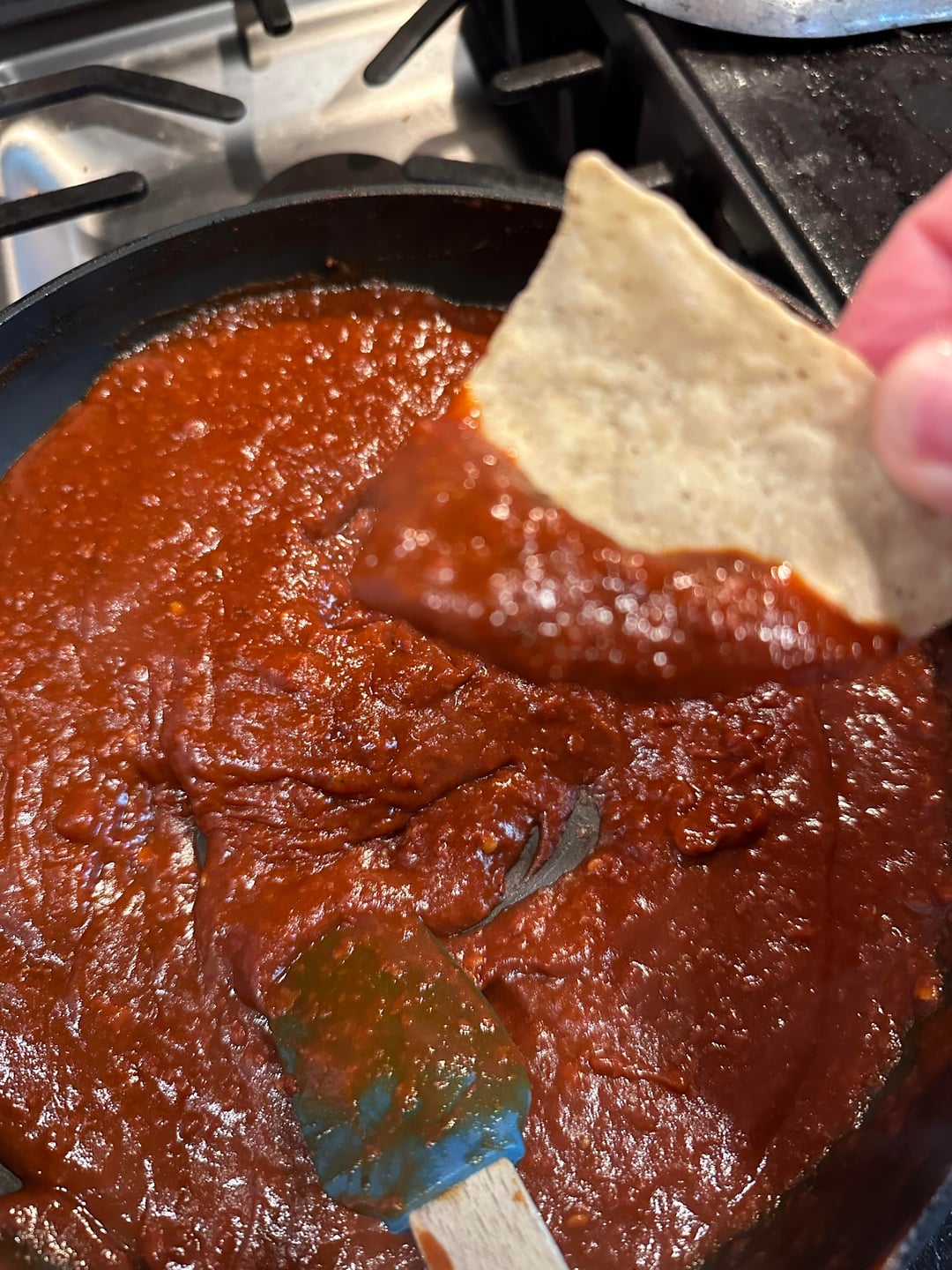 Once cooled, use as a salsa dip. Thin with chicken broth until desired thickness. This is a versatile sauce/dip and can be used in pork to make tamales, or a posole sauce, used with ground beef for Frito pie base. Great on top of eggs, or used on rice or veggies.