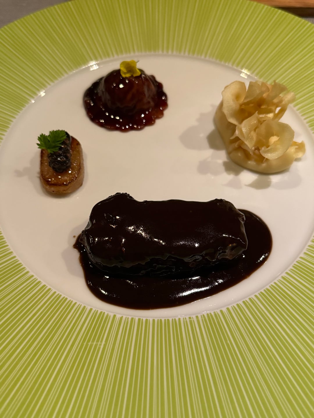 Actually nice overall and tasty sauce but a bit too gamey even with all the sauce, just not my favorite cut of venison, and a bit 1 note with the same sauce used for the meat and ravioli. 7/10