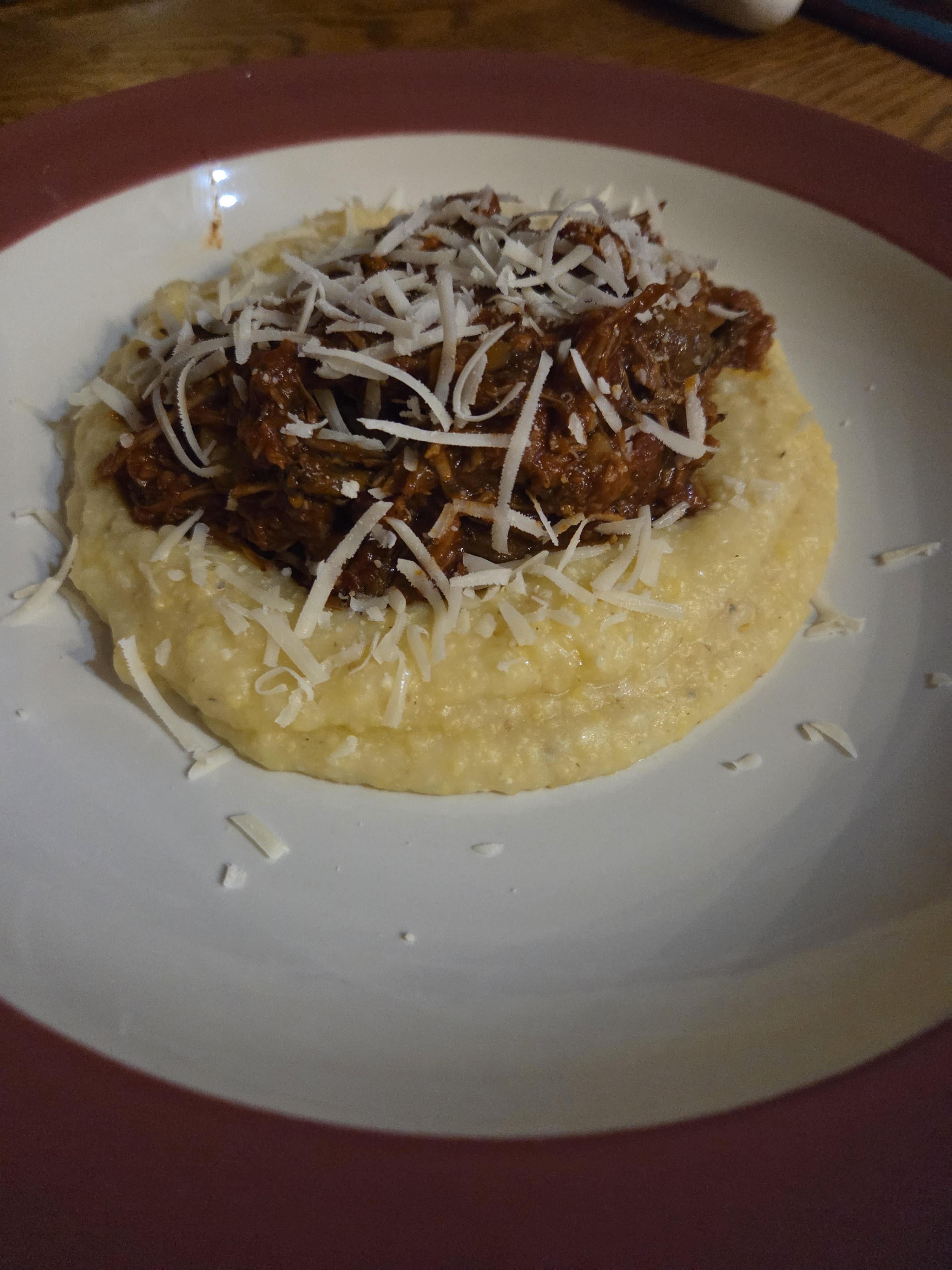 The Polenta made with the linked recipe. I finished with an extremely good olive oil but it still was missing something imo. Used a good corn meal Bobs red mill medium ground and presoaked for 12 hours. cook time about 45 minutes, before the finishing step. Was good but mildly disappointed.https://www.seriouseats.com/smooth-creamy-polenta-recipe
