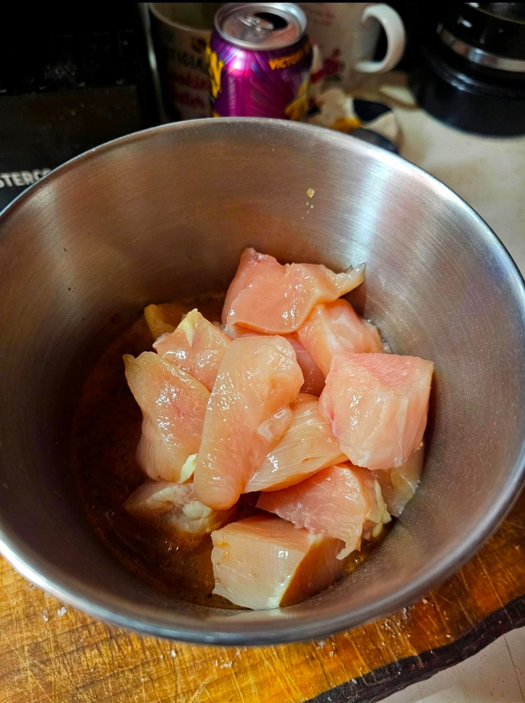 I also had some leftover champagne from nye so why not use that for a marinade? Whisk some champagne, SPPOG, and a little chili powder then add some cut up chicken and let it marinate while the potatoes soak and you drink a few beers 🤣
