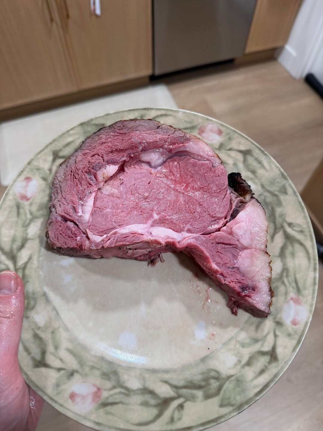 Timing in sous vide can be finnicky. If left in “too long” I found the meat became a bit more…. candied? Texture and tase started to compare to a ham more than a steak. Also seeing some sous vide instructions suggest chilling the meat in an ice bath followed by refrigeration overnight before searing making it a 24 hour process where 15-20 minutes per pound in the oven + 30-60 minutes of resting would do the trick.