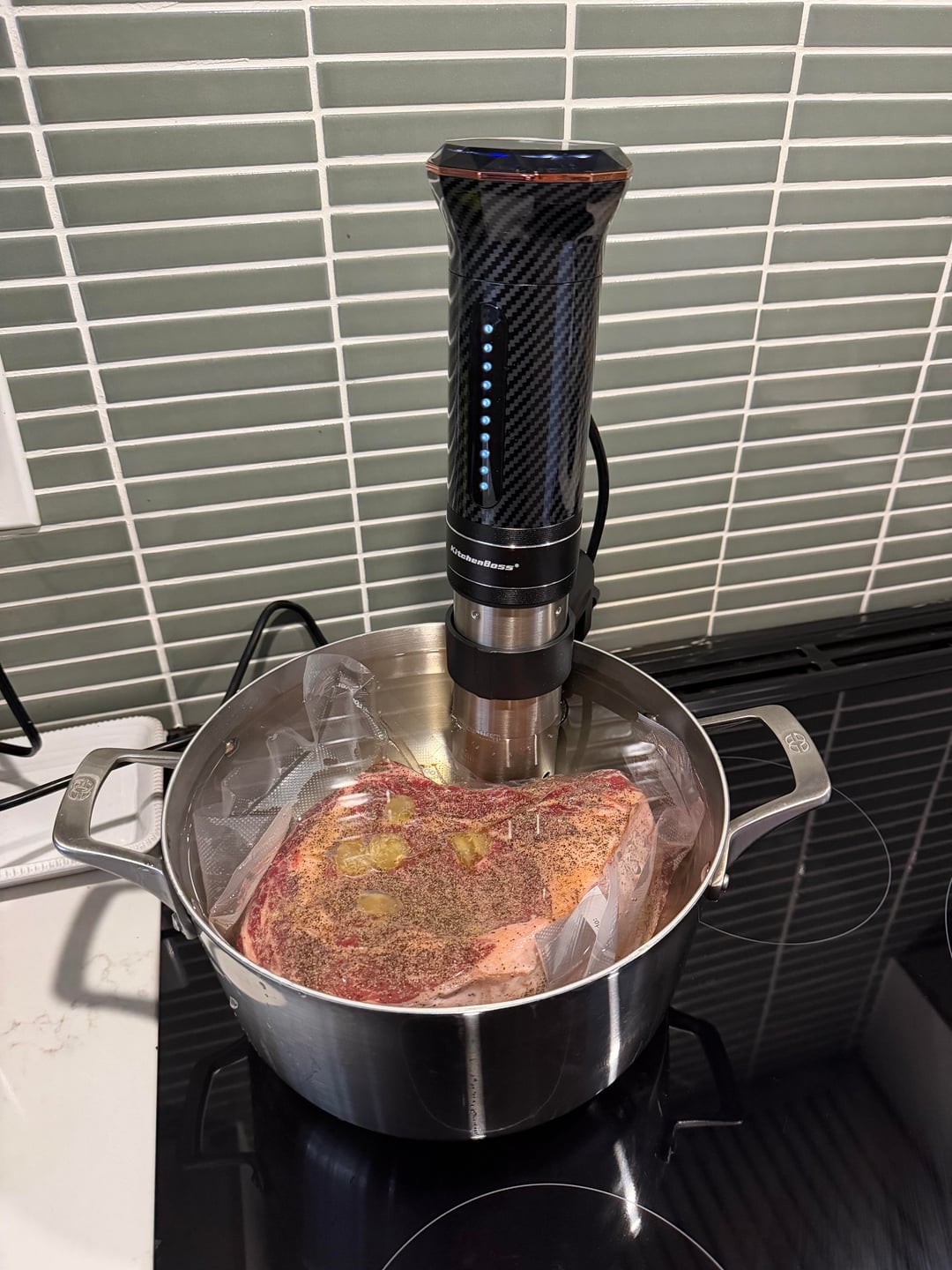 Some advice- get a bigger pot/insulated container with a silicon lid to hold the heat in- Amazon has some insulated ones that hold heat very well and circulate a higher volume of water – which just uses less electricity and keeps a more consistent water bath temp flowing around the roast. As you know the objective is to pull cold out of the meat all the way thru the center- to get the entire slab the same temp and never over cook. 130 worked for me then I put a lot of color/crust on when done.