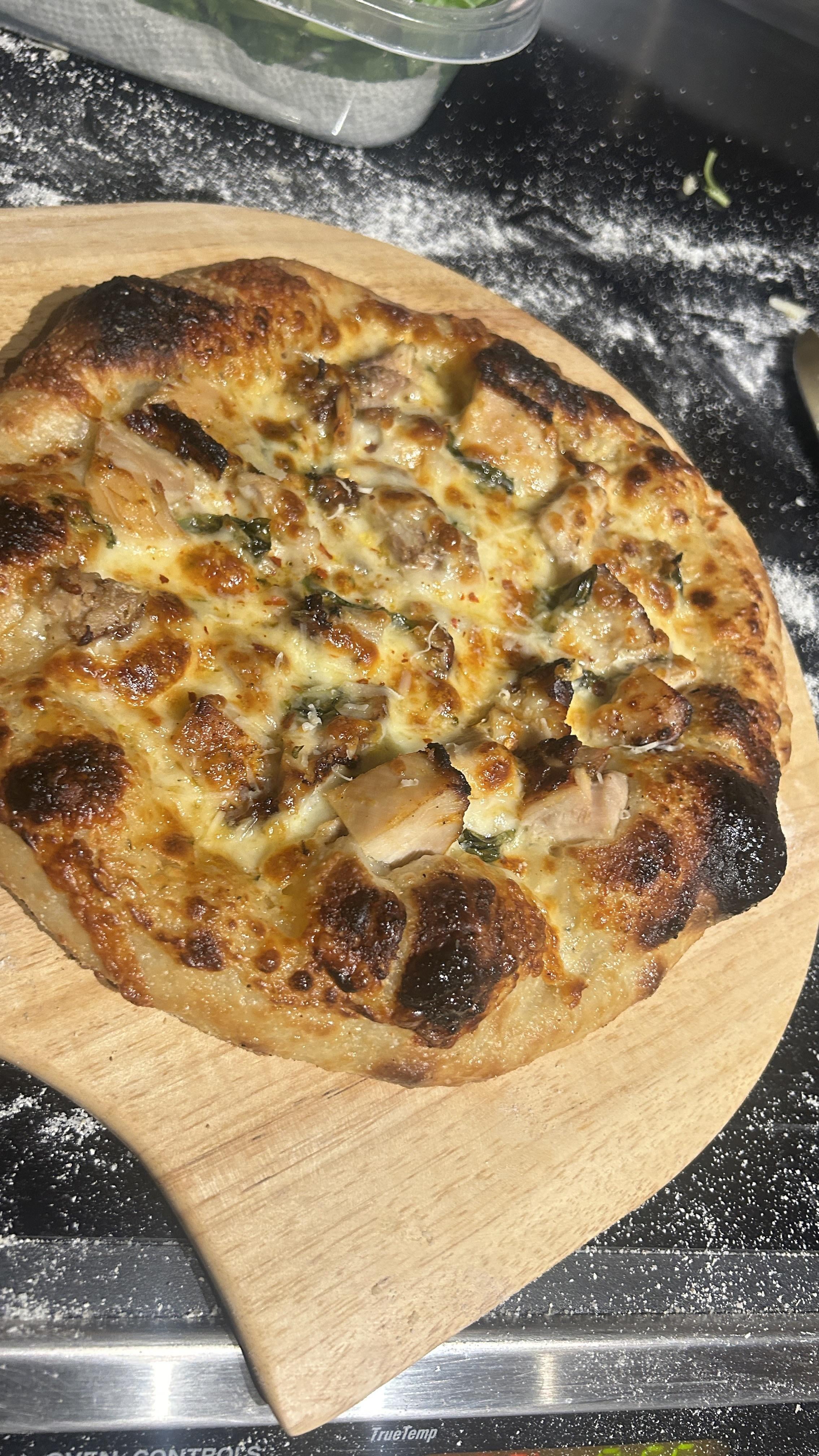 i used a pizza stone in a home oven at 550. i make a 3 day cold fermented dough then freeze it for whenever i'm too lazy to do a full meal prep. topped with homemade alfredo sauce, mozz, pepperjack, basil, and chipotle chicken with parm sprinkled on top 🙂