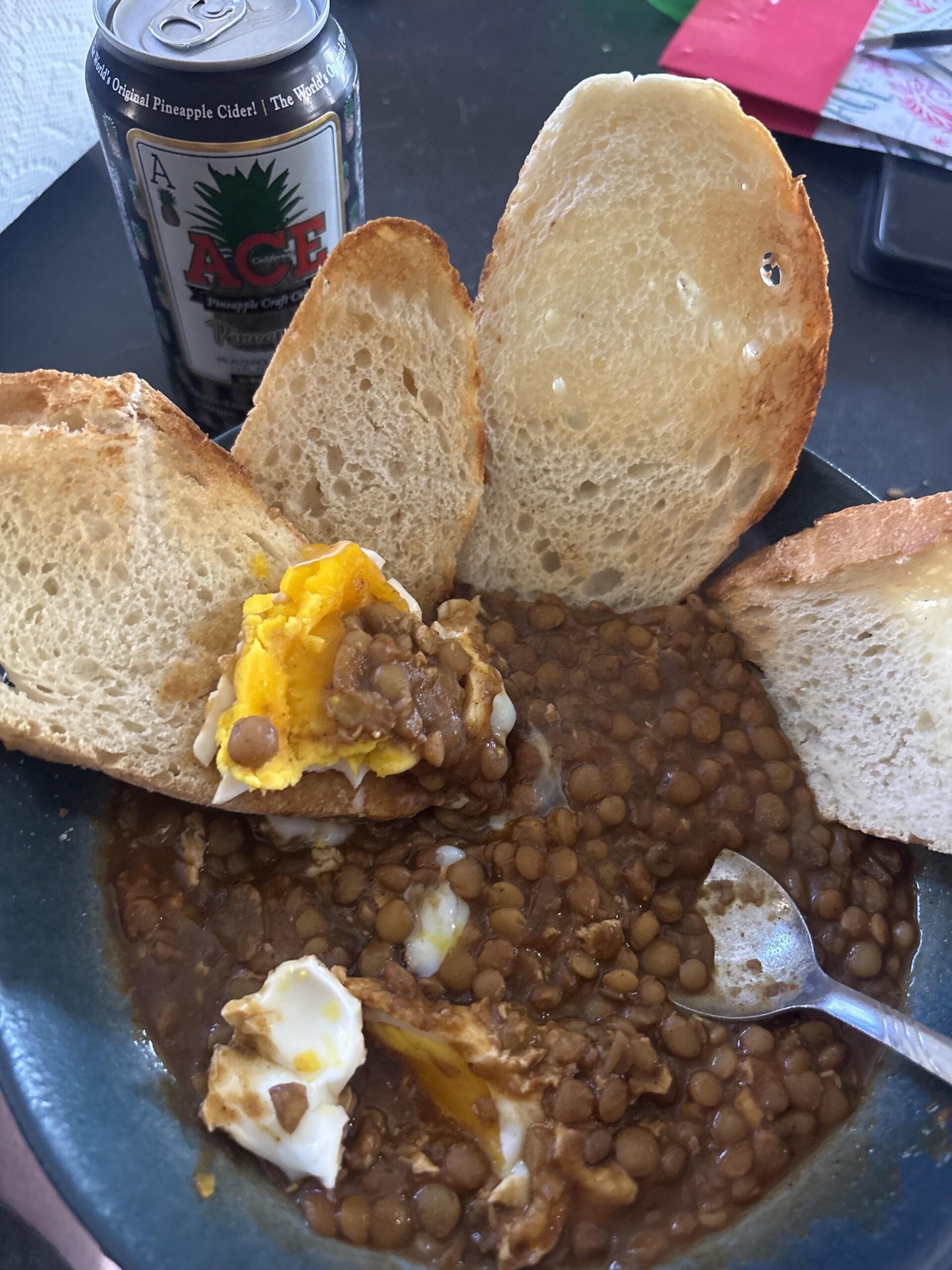 toasted sourdough lentil’n’shallot stew with a couple eggs dropped in and cooked medium washed down with some yummy ace pineapple cider by mycology-student 1 Comment StolenCoupe 2 months ago Beans on Toasht! I approve this.