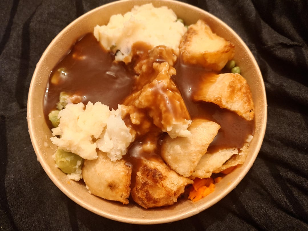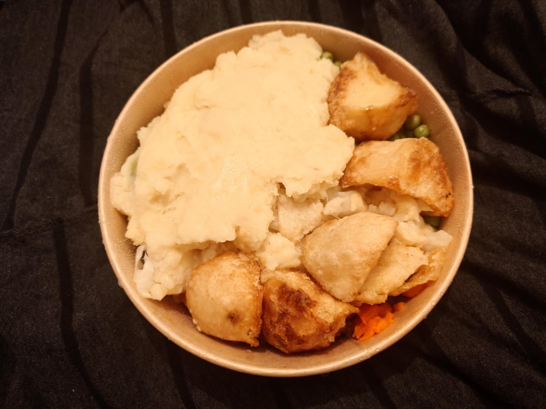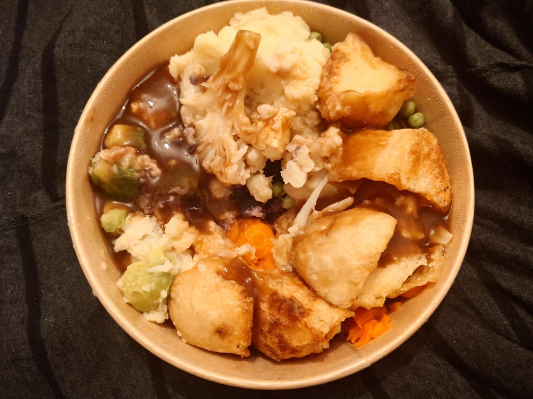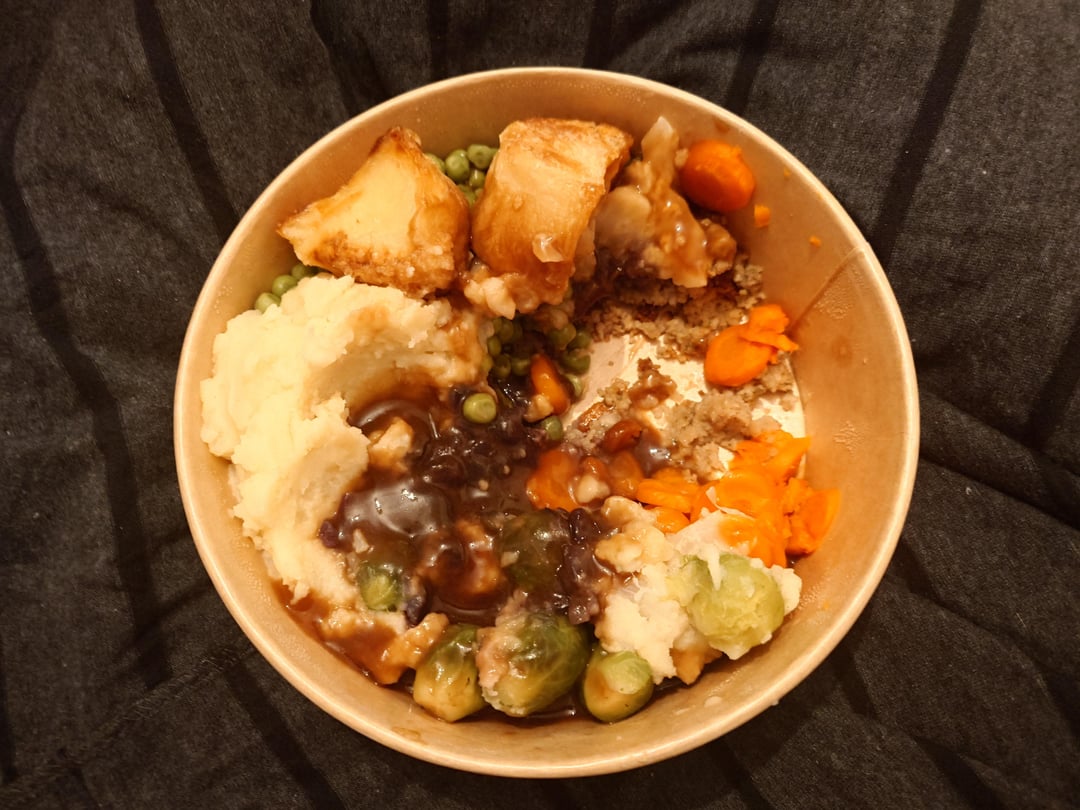18cm diameter, 6cm deep tub with layers of mash, roasties, stuffing, red cabbage chutney, cauliflower, peas, carrots and sprouts with a side tub of veggie gravy.