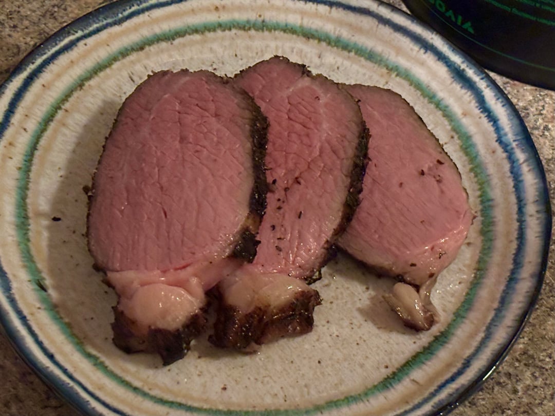 They just keep getting better and better. This time I coated two 3 pounders with olive oil and put on as much Kinder’s Prime Rib Seasoning as they would take before vac bagging and letting them sit overnight in the fridge. Sous vide at 130F for 23 hrs then into ice water before retiring them to the fridge for dinner. After work, I opened the bags, dried them with paper towels, seared in a heavily buttered carbon steel skillet and finished with a torch and thickly sliced for dinner rather than thinly sliced for sandwiches. Damn! I’m never going to tire of this.