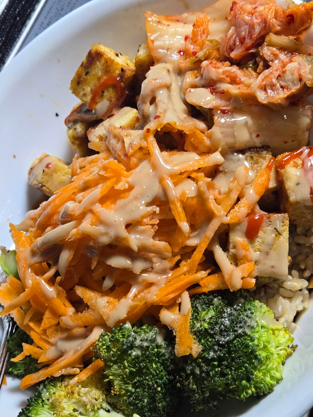 Baked tofu&broccoli brown rice bowl. Topped with kimchi, grated carrots, sriracha, tahini, sunflower seeds and hemp hearts.by FlourAndFleur 1 Comment Fuzzy_Welcome8348 18 hours ago Looks lovely!